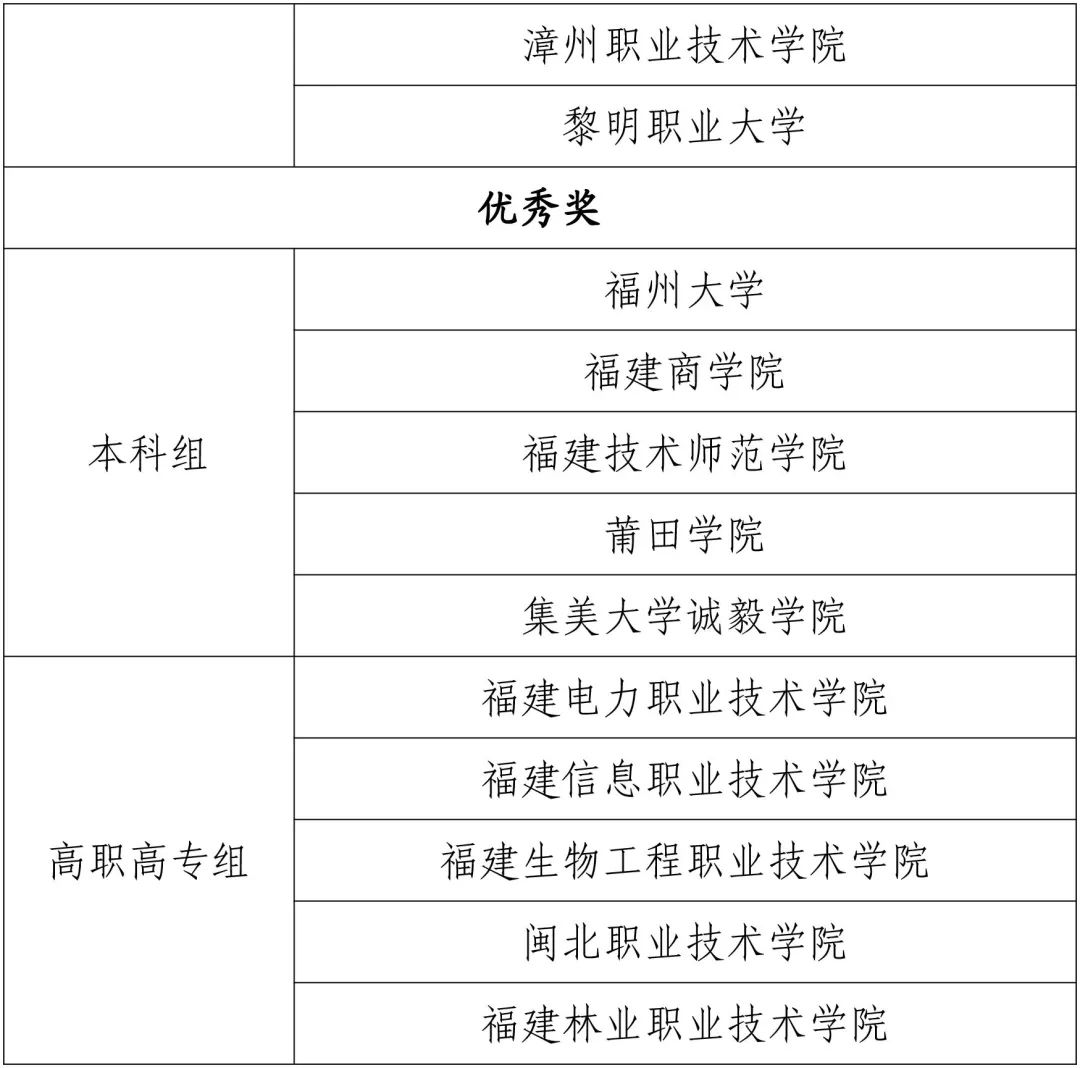 福建船政交通職業(yè)學(xué)院、福建衛(wèi)生職業(yè)技術(shù)學(xué)院獲高職高專組團體一等獎;閩江學(xué)院等3所學(xué)校獲本科組團體二等獎,廈門城市職業(yè)學(xué)院等3所學(xué)校獲高職高專組團體二等獎;福建農(nóng)林大學(xué)等5所學(xué)校獲本科組團體三等獎,湄洲灣職業(yè)技術(shù)學(xué)院等5所學(xué)校獲高職高專組團體三等獎。