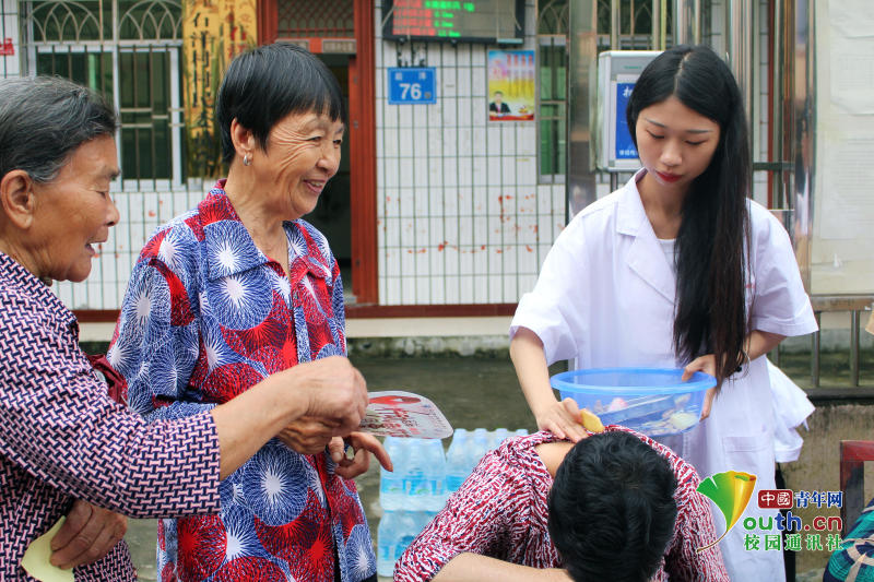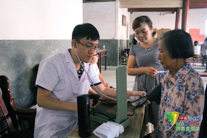 圖為指導(dǎo)老師為村民測量血壓 中國青年網(wǎng)通訊員 詹微微 攝