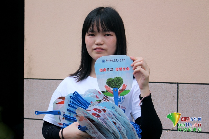 圖為實踐隊員在派發(fā)遠(yuǎn)離毒品宣傳扇子 中國青年網(wǎng)通訊員 詹微微 攝