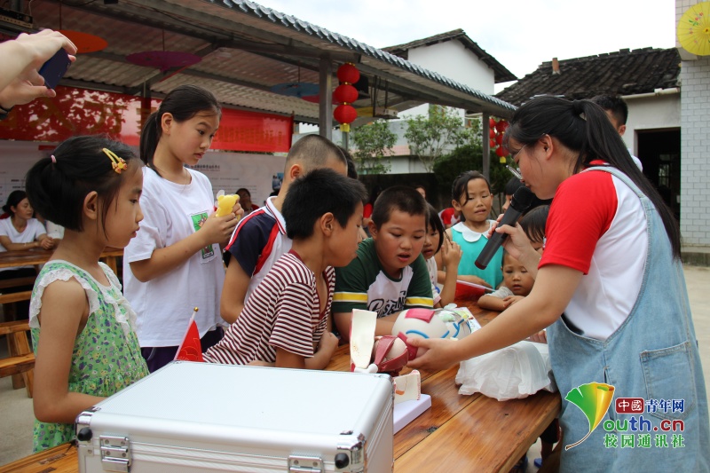 給小朋友發(fā)放書本等學(xué)習(xí)用品,教導(dǎo)小朋友要努力學(xué)習(xí),爭當(dāng)新時代接班人。中國青年網(wǎng)通訊員 方江財 攝