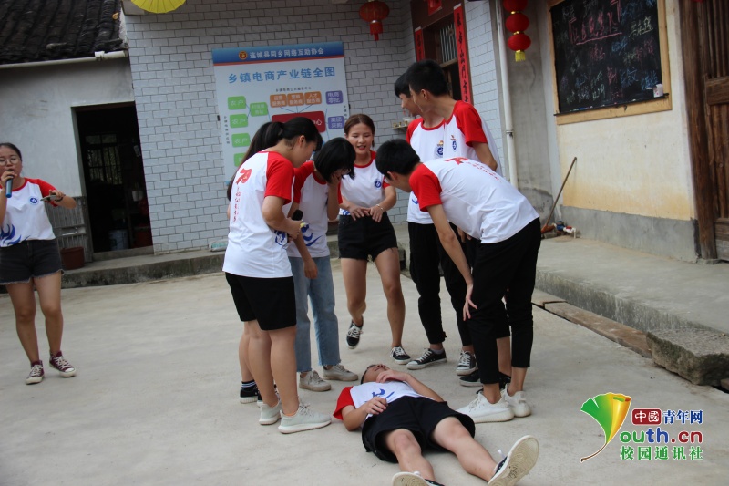 志愿者扮演心臟病突發(fā)的患者,來向小朋友和現(xiàn)場的家長們展示如何進(jìn)行救援行動。中國青年網(wǎng)通訊員 方江財 攝