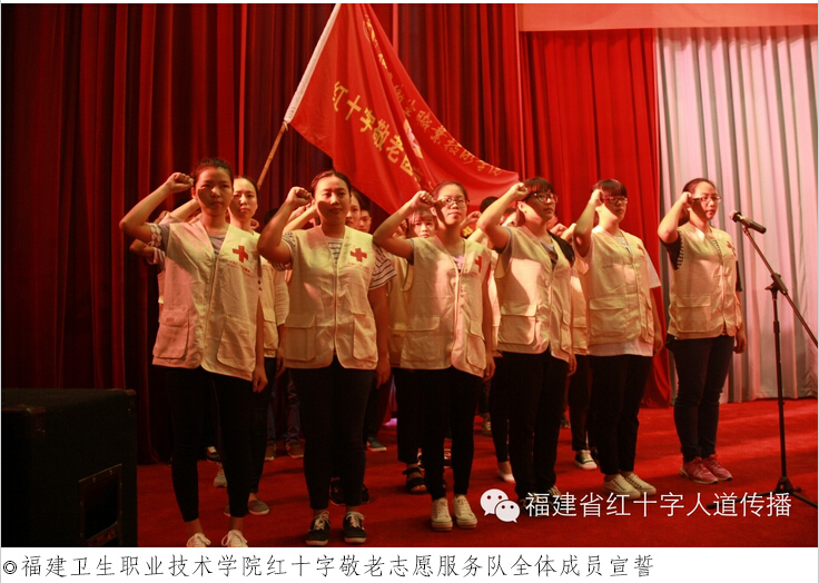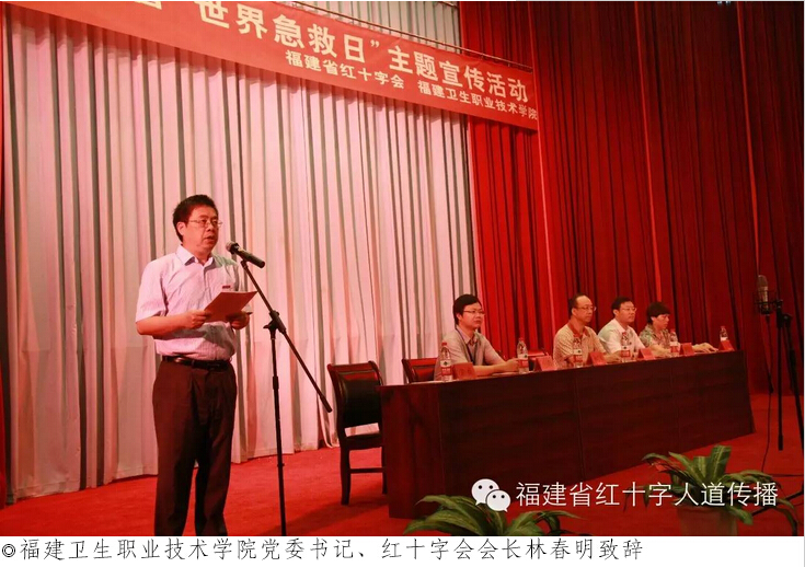 9月12日是第16個(gè)“世界急救日”,今年的主題是“急救與老齡化人群”。上午,由福建省紅十字會主辦、福建衛(wèi)生職業(yè)技術(shù)學(xué)院紅十字會承辦的“2015年‘世界急救日’系列活動(dòng)啟動(dòng)暨福建衛(wèi)生職業(yè)技術(shù)學(xué)院紅十字敬老志愿服務(wù)隊(duì)成立儀式”在福建衛(wèi)生職業(yè)技術(shù)學(xué)院學(xué)術(shù)廳舉行,福建省紅十字會黨組書記、常務(wù)副會長黃毅敏,省紅十字會副秘書長蔡康政,福建衛(wèi)生職業(yè)技術(shù)學(xué)院黨委書記、紅十字會會長林春明,衛(wèi)生職業(yè)技術(shù)學(xué)院紅十字會秘書長宋維出席活動(dòng)儀式。