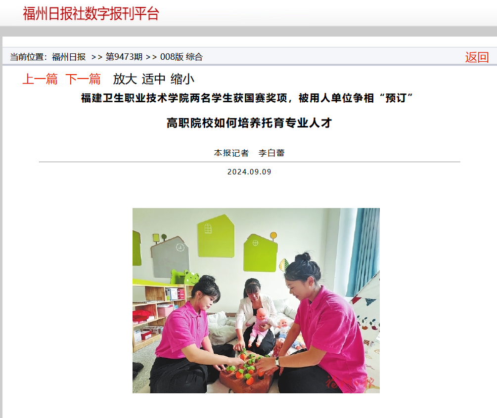 市總工會(huì)基層工作部部長(zhǎng)陳麗燕告訴記者,福州共有5所在榕高職院校培養(yǎng)托育專(zhuān)業(yè)人才,市賽的學(xué)生選手都來(lái)自這些院校。“說(shuō)實(shí)話(huà),比賽前,我們不知道福建衛(wèi)生職業(yè)技術(shù)學(xué)院有開(kāi)辦托育專(zhuān)業(yè),更不知道他們的辦學(xué)水平。當(dāng)比賽成績(jī)出來(lái)時(shí),評(píng)委們都感嘆這兩名女生是‘黑馬’?!标慃愌嗾f(shuō),之后的省賽和全國(guó)賽上,她們憑借過(guò)硬的專(zhuān)業(yè)知識(shí)、操作技能和綜合能力頻頻獲獎(jiǎng),尤其是省賽不僅取得團(tuán)體一等獎(jiǎng),兩人還分獲個(gè)人獎(jiǎng)項(xiàng)。