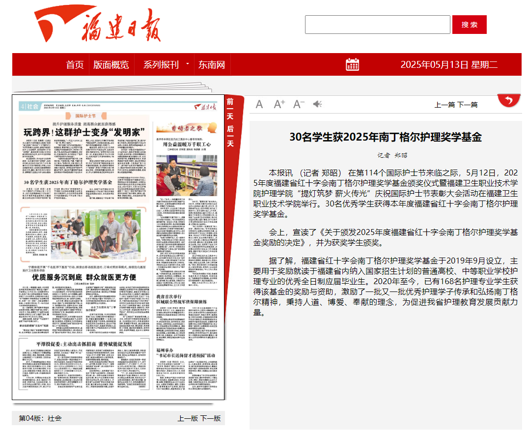 本報(bào)訊 (記者 鄭昭) 在第114個(gè)國(guó)際護(hù)士節(jié)來(lái)臨之際,5月12日,2025年度福建省紅十字會(huì)南丁格爾護(hù)理獎(jiǎng)學(xué)基金頒獎(jiǎng)儀式暨福建衛(wèi)生職業(yè)技術(shù)學(xué)院護(hù)理學(xué)院“提燈筑夢(mèng) 薪火傳光”慶祝國(guó)際護(hù)士節(jié)表彰大會(huì)活動(dòng)在福建衛(wèi)生職業(yè)技術(shù)學(xué)院舉行。30名優(yōu)秀學(xué)生獲得本年度福建省紅十字會(huì)南丁格爾護(hù)理獎(jiǎng)學(xué)基金。