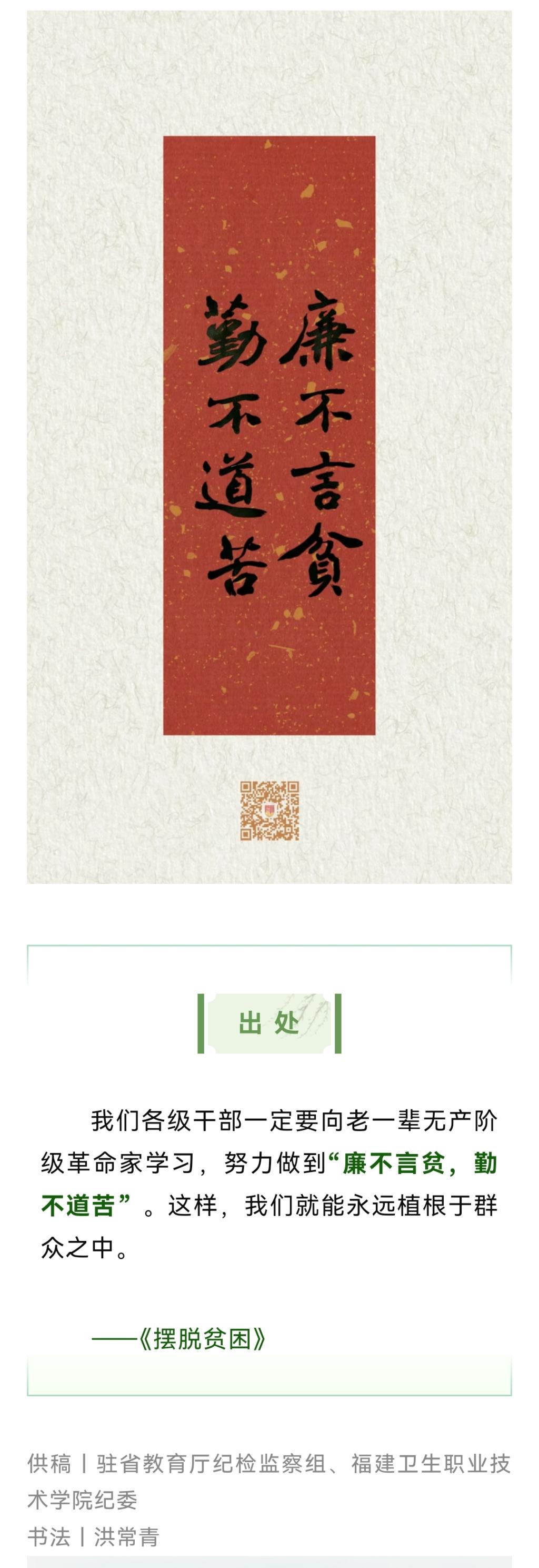 5月24日,“福建紀(jì)檢監(jiān)察”微信公眾號推送學(xué)校選送的“學(xué)習(xí)廉語”——“廉不言貧,勤不道苦”。