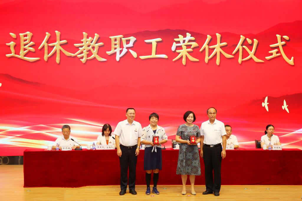隨后進行了教職工榮休儀式,曾武祈、許能鋒為退休教職工代表鄭韻芳、蔡丹鳳2位老師頒發(fā)了“光榮退休紀(jì)念章”,代表學(xué)校向她們及全體離退休教職工致以衷心感謝和崇高敬意。