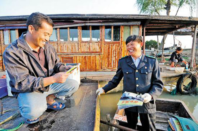每次去投遞,唐真亞總會(huì)記錄下漁民們需要的生活用品,并買來給他們送到家門口。除了信件、報(bào)刊等,他船上往往還捎著給漁民們帶的東西:日用品、浮球、煤氣、米面……十分豐富。時(shí)間久了,漁民們就把存取錢、交話費(fèi)的事也交給了他。唐真亞既當(dāng)郵遞員,又當(dāng)采購員、送貨員。為了抓緊時(shí)間投遞,給漁民朋友送東西,每次出門,他會(huì)給自己帶上些烙餅等食物。他的午飯和晚飯,經(jīng)??窟@些在船上解決?!皫椭鷦e人讓我感覺心中很滿”。唐真亞說。