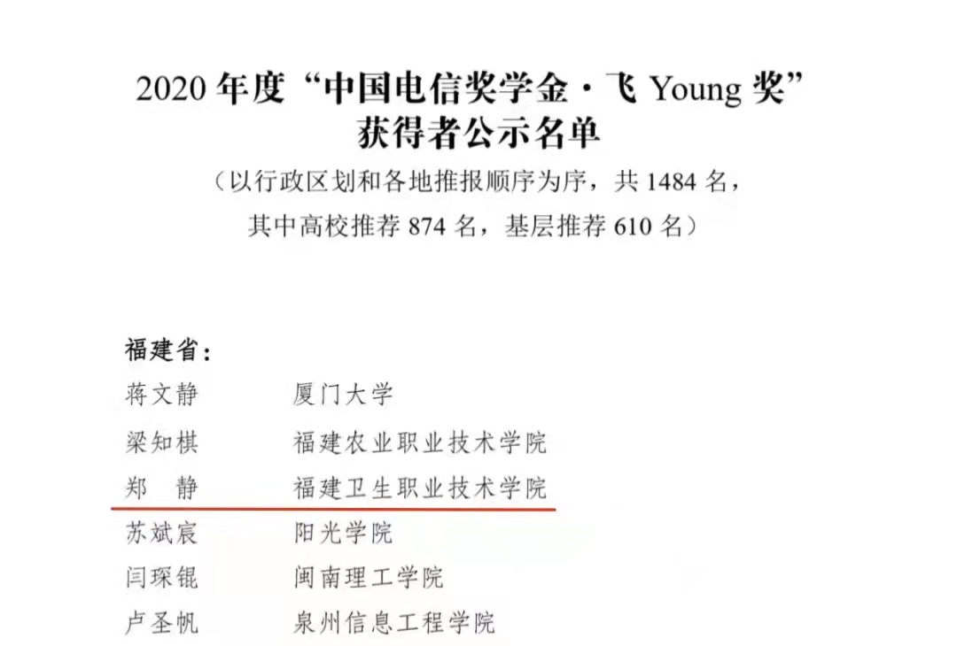 近日,2020年度“中國電信獎學(xué)金”名單公布。經(jīng)校級推薦,省級初評和全國評審,確定 “中國電信獎學(xué)金?飛Young獎”獲得者1484名。我校19檢驗303班鄭靜同學(xué)在評選中脫穎而出,獲得“中國電信獎學(xué)金·飛Young獎”。