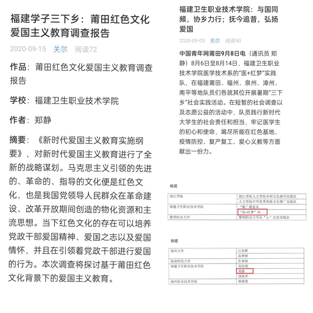 鄭靜,福建衛(wèi)生職業(yè)技術(shù)學(xué)院醫(yī)學(xué)技術(shù)系學(xué)生,入黨積極分子,曾任系團總支學(xué)生副書記、醫(yī)學(xué)技術(shù)系業(yè)余分黨校班長、班級團支部書記,現(xiàn)擔(dān)任中國人民解放軍聯(lián)勤保障部隊第九〇〇醫(yī)院檢驗專業(yè)實習(xí)隊長。