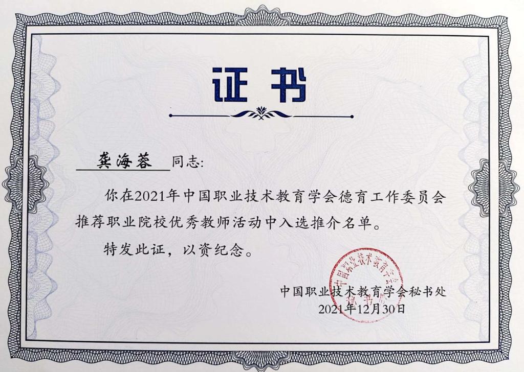 近日,由中國職業(yè)技術(shù)教育學(xué)會組織的“職業(yè)院校優(yōu)秀教師、優(yōu)秀畢業(yè)生和優(yōu)秀在校生”推薦活動結(jié)果揭曉,我校護理學(xué)院院長龔海蓉副教授入選2021年中國職業(yè)技術(shù)教育學(xué)會德育工作委員會優(yōu)秀教師。