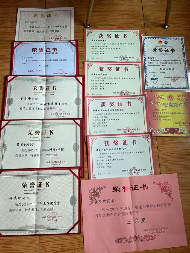 吳鋒老師:黃炎珍同學為人誠懇,謙虛,樸實無華,思想積極上進,身處逆境,卻永不退縮。從中職入學的青澀小姑娘變成了現在成熟干練的省賽一等獎獲得者,一路成長,離不開她敢想、敢為、敢說、敢問的求知精神,相信她憑借著自身的努力奮斗與拼搏,會成為一名優(yōu)秀的新一代護理人。