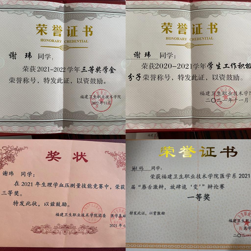 ?成為一名醫(yī)生,是謝瑋從小的夢想。帶著這份初心,她考入福建衛(wèi)生職業(yè)技術(shù)學院臨床醫(yī)學專業(yè),開啟了醫(yī)學追夢之路。在校期間,她始終牢記入學第一天所學的“技在高,更在德;術(shù)在巧,更在仁。看的是病,救的是心;開的是藥,給的是情?!钡尼t(yī)者信條,用赤誠的學醫(yī)之心和奉獻精神在校園中不斷積累,刻苦學習專業(yè)知識,積極參與校園活動,擔任班級學習委員,服務同學,提升自我。她不僅在學業(yè)上表現(xiàn)優(yōu)異,還獲得了辯論賽一等獎、“學生工作積極分子”等榮譽,展現(xiàn)了全面發(fā)展的青春風采。