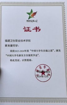 黃育豪,男,漢族,中共預(yù)備黨員,福建衛(wèi)生職業(yè)技術(shù)學(xué)院22級(jí)臨床醫(yī)學(xué)(高本貫通)602班學(xué)生,曾任班級(jí)副班長(zhǎng),現(xiàn)擔(dān)任福清市醫(yī)院實(shí)習(xí)隊(duì)長(zhǎng)。學(xué)習(xí)期間,先后獲得國(guó)家級(jí)、省級(jí)獎(jiǎng)項(xiàng)6項(xiàng)。近期,在由共青團(tuán)中央、中華全國(guó)學(xué)生聯(lián)合會(huì)指導(dǎo),中國(guó)青年報(bào)社、新東方教育科技集團(tuán)、中國(guó)青年創(chuàng)業(yè)就業(yè)基金會(huì)聯(lián)合開(kāi)展的2023-2024年度“中國(guó)大學(xué)生自強(qiáng)之星”評(píng)選中榮獲“中國(guó)大學(xué)生自強(qiáng)之星”榮譽(yù)稱號(hào)。