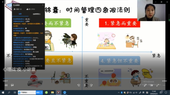 在學(xué)生的時(shí)間管理方面,夏雪梅老師首先通過“自覺飛鏢大作戰(zhàn)”的游戲,給各位同學(xué)們?cè)O(shè)置起床、專心做作業(yè)、認(rèn)真聽網(wǎng)課等六個(gè)居家情境,來測(cè)試同學(xué)們的自覺以及時(shí)間管理的情況,而后通過講授時(shí)間管理四象限法則,提醒同學(xué)們重要不緊急的事情要有準(zhǔn)備的做,不重要不緊急的事穿插著做,最后也鼓勵(lì)大家根據(jù)四象限法則制作自己的時(shí)間作息表。