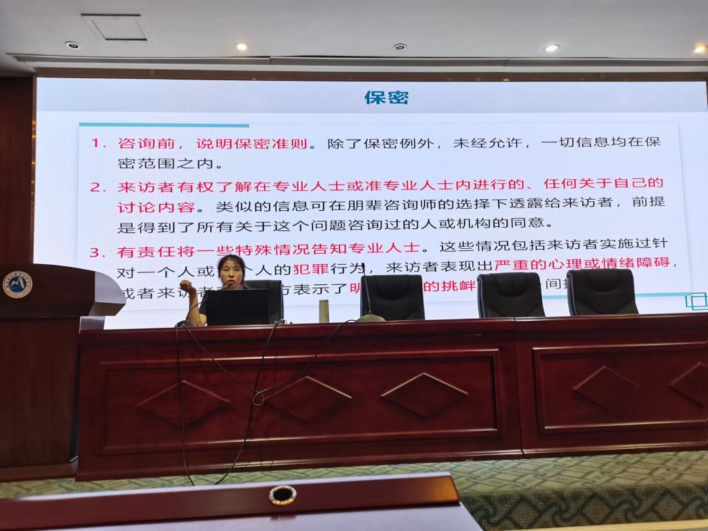 夏雪梅講解了什么是心理危機(jī)、如何識(shí)別心理危機(jī)信號(hào)、發(fā)現(xiàn)心理危機(jī)時(shí)應(yīng)如何上報(bào)。同時(shí),她還從朋輩心理輔導(dǎo)的倫理概念、倫理原則、倫理準(zhǔn)則和八大戒律四個(gè)方面給大家介紹了朋輩心理輔導(dǎo)的倫理規(guī)范和實(shí)操規(guī)范。
