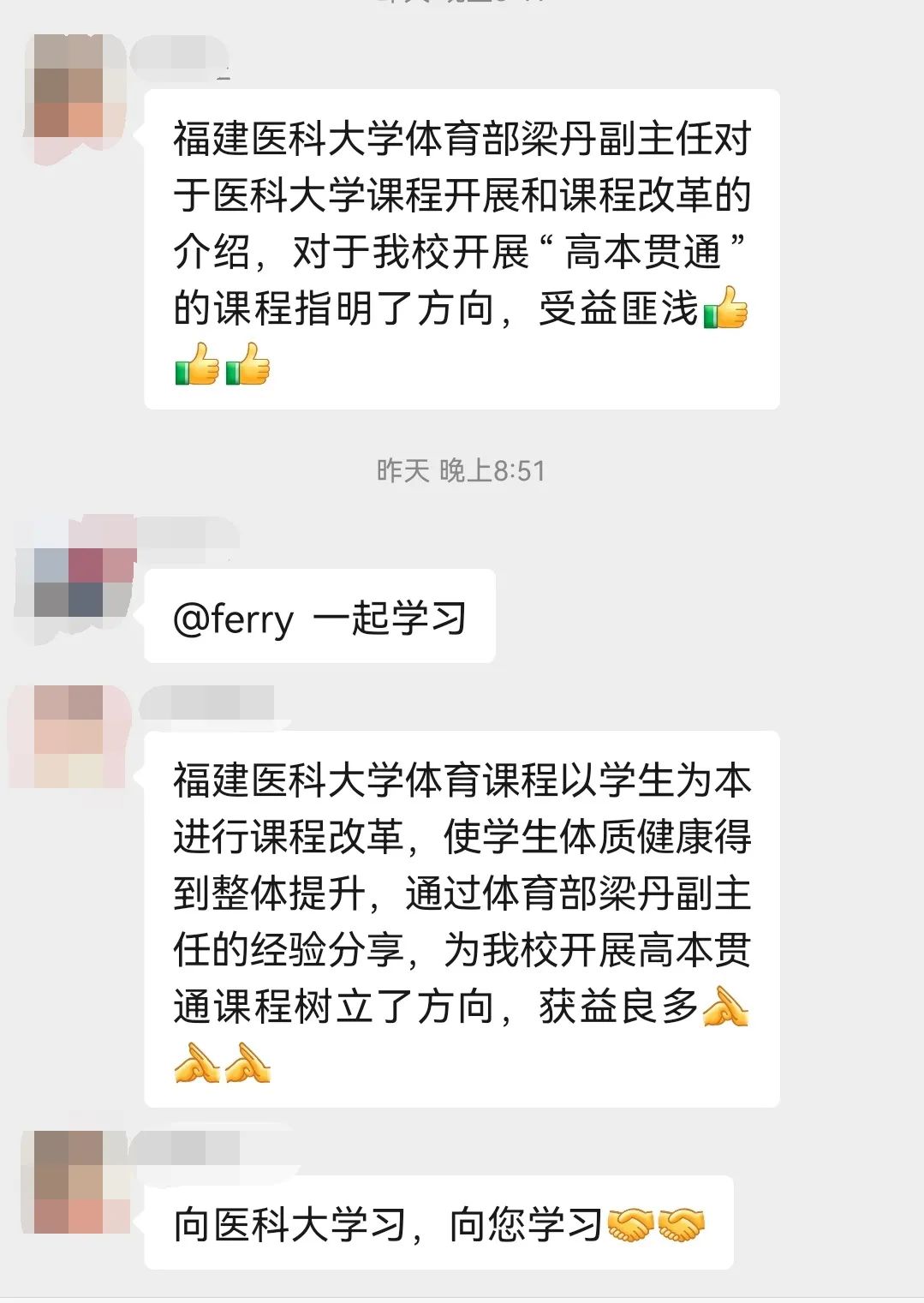 因受疫情影響,2021年9月14日下午,我校體育部與福建醫(yī)科大學(xué)體育部聯(lián)合召開“高本貫通”體育課程線上學(xué)習(xí)交流會(huì)。會(huì)議由我校體育部阮秋容副主任主持,體育部全體教職人員參加本次學(xué)習(xí)。