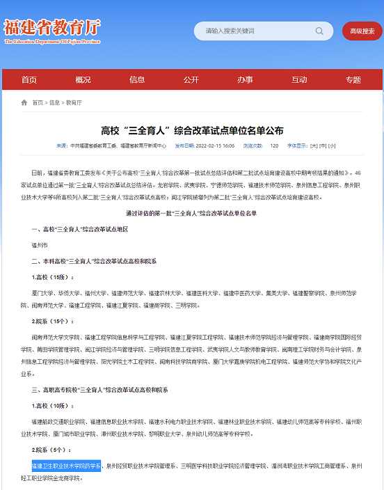 近日,福建省委教育工委發(fā)布《關(guān)于公布高?!叭恕本C合改革第一批試點總結(jié)評估和第二批試點培育建設(shè)高校中期考核結(jié)果的通知》,我校藥學(xué)院順利通過高職高專院校第一批“三全育人”綜合改革試點院系總結(jié)評估。