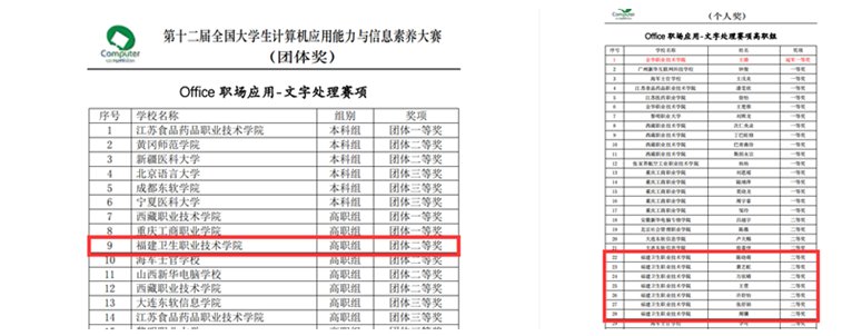 6月11日,2022年第十二屆全國大學(xué)生計算機應(yīng)用能力與信息素養(yǎng)大賽“Office職場應(yīng)用Word文字處理”賽項于線上舉行。我校衛(wèi)生信息管理專業(yè)黃藝虹、周驥、王萱、萬依晴、陳曉萌、許舒怡、張舒穎等七名選手獲得個人二等獎,我校代表隊榮獲團體二等獎。