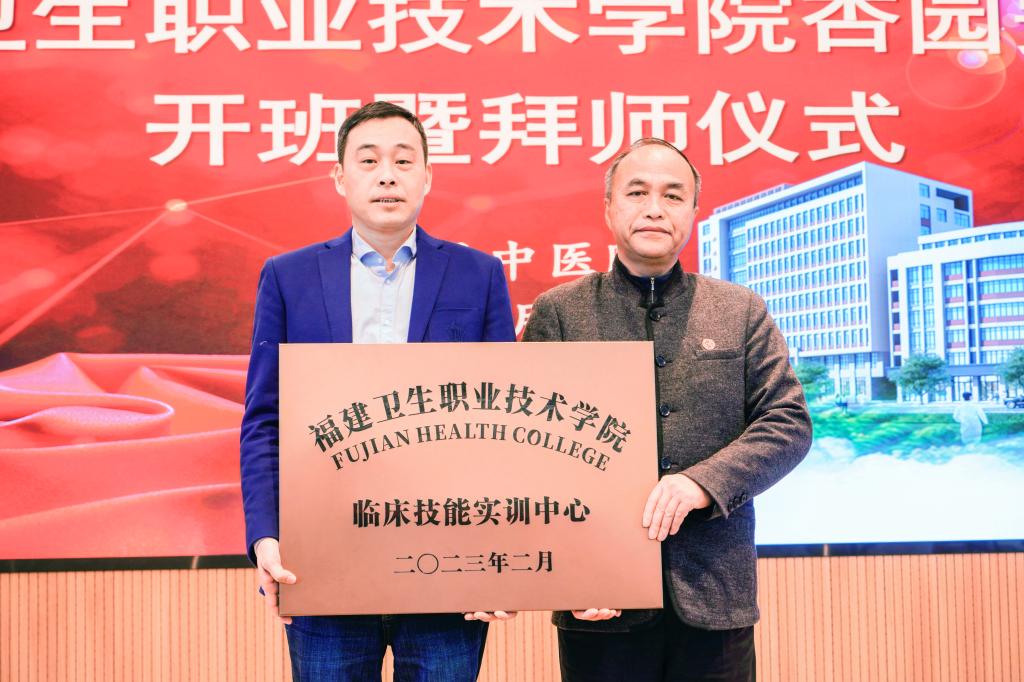 校黨委書(shū)記曾武祈(左)與福州市中醫(yī)院院長(zhǎng)楊曉煜(右)共同為“臨床技能實(shí)訓(xùn)中心”揭牌授牌