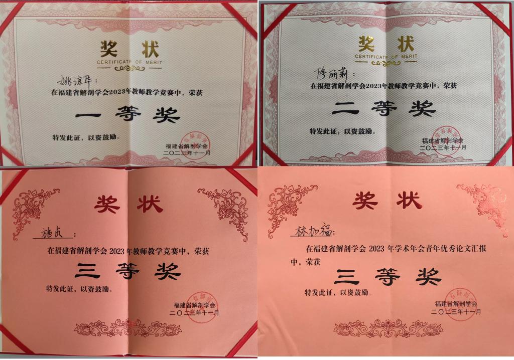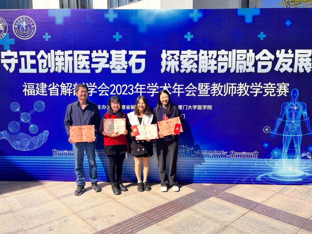 在教師教學競賽中,來自省內(nèi)近20所醫(yī)藥衛(wèi)生類院校的優(yōu)秀解剖學教師同臺競技,展現(xiàn)了各自的授課風采。我校醫(yī)學院解剖學教研室姚瓊?cè)A、修麗莉、施貞三位教師以穩(wěn)健的臺風和精彩的授課內(nèi)容,分別榮獲福建省解剖學會2023年教師教學競賽第一名、第二名和第四名。