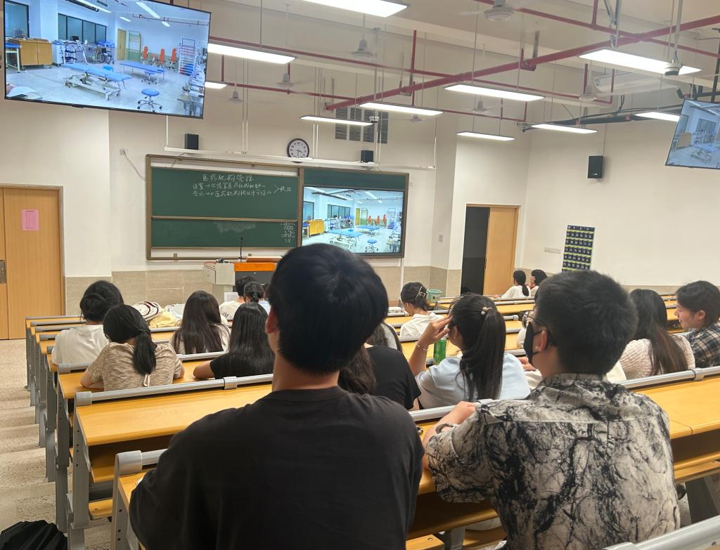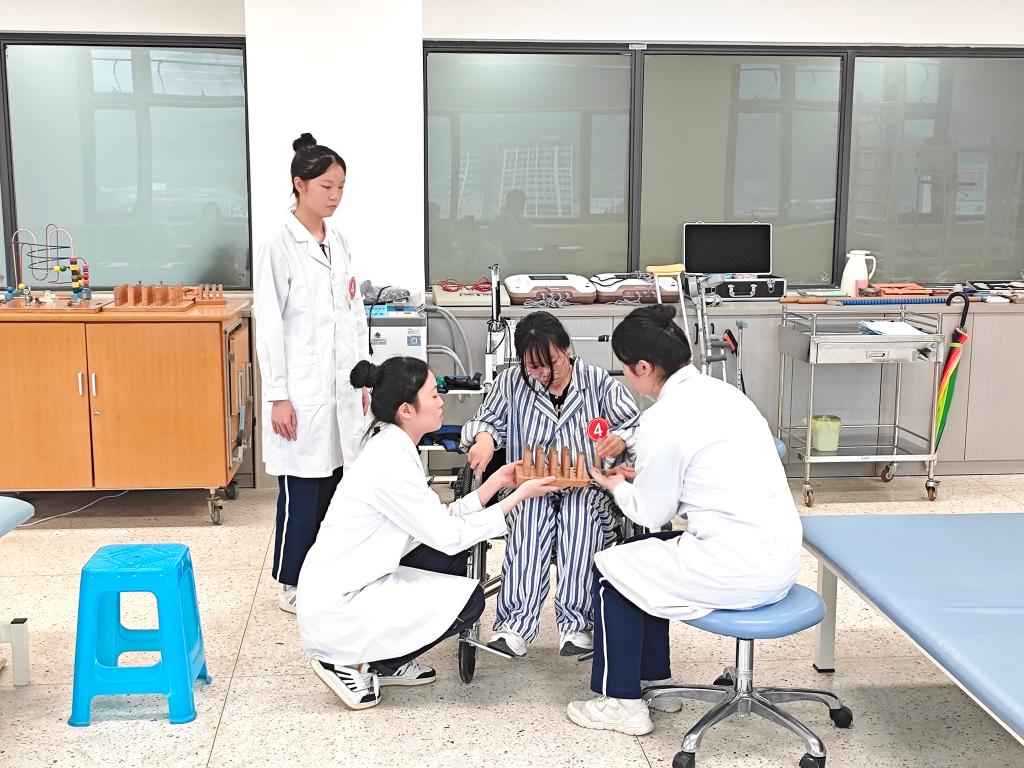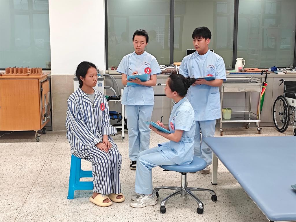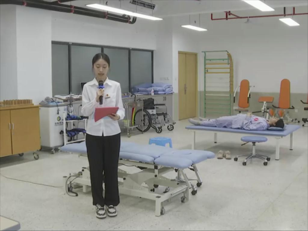 決賽采取團(tuán)隊(duì)作戰(zhàn)形式隨機(jī)抽取案例,面對(duì)標(biāo)準(zhǔn)化病人,參賽團(tuán)隊(duì)分工進(jìn)行康復(fù)問診、康復(fù)評(píng)定和康復(fù)治療操作項(xiàng)目。比賽過程充分展示康復(fù)工作團(tuán)隊(duì)的協(xié)作高要求與康復(fù)診療技巧的多樣性,體現(xiàn)康復(fù)治療師在溝通、判斷、關(guān)懷等方面的綜合素質(zhì)。教室及線上的觀眾運(yùn)用網(wǎng)絡(luò)平臺(tái)實(shí)時(shí)觀看現(xiàn)場(chǎng)直播,沉浸式體驗(yàn)賽事過程。