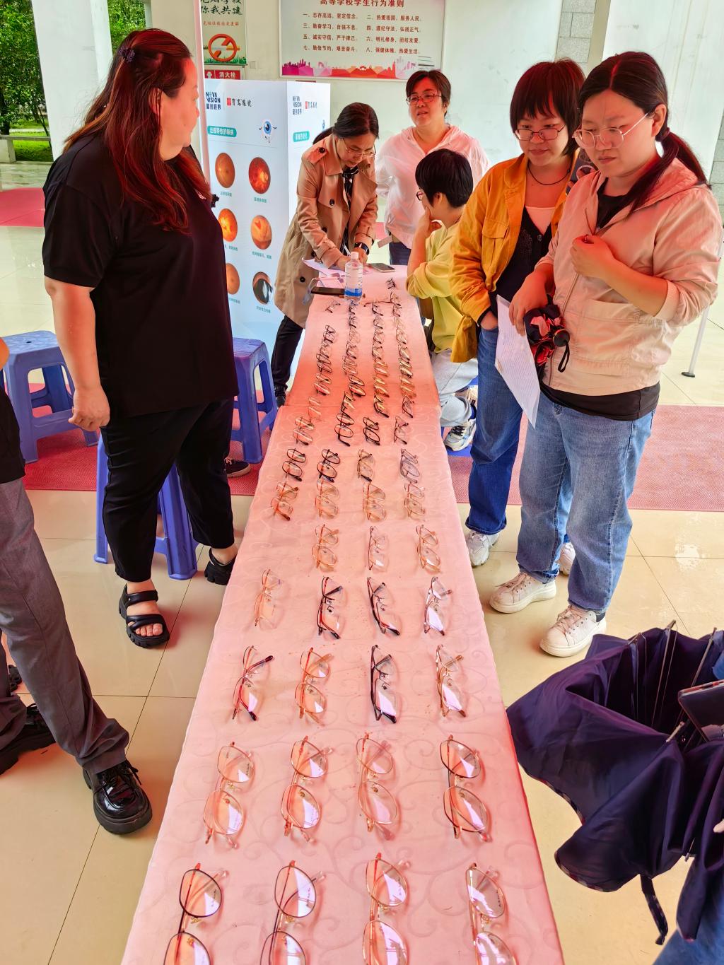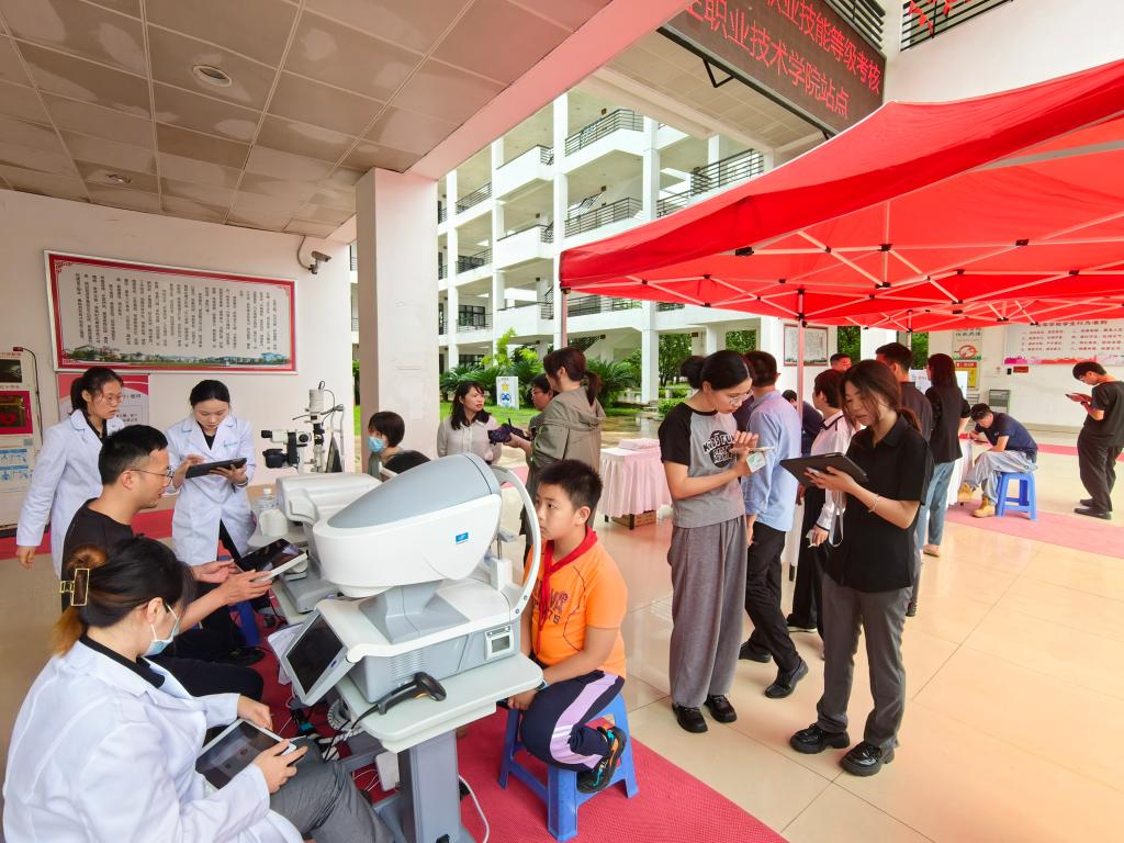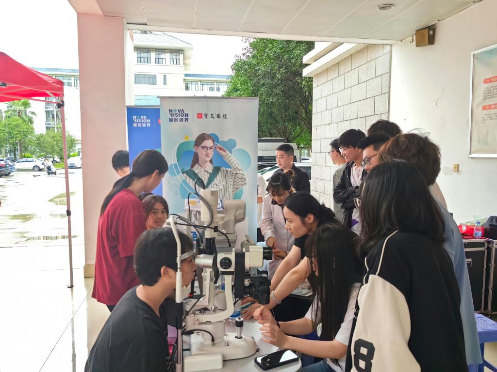 活動分為兒童青少年近視防控篩查與科普、眼病篩查、醫(yī)學(xué)驗光配鏡等環(huán)節(jié)。校企雙方驗光師通過專業(yè)先進儀器為現(xiàn)場師生評估雙眼度數(shù)、晝夜視差、有無視疲勞以及患圓錐角膜、白內(nèi)障、青光眼等眼病的風(fēng)險,評估高度近視眼底病變風(fēng)險,眼視光教研室老師們現(xiàn)場解釋檢查報告結(jié)果;部分師生直接在現(xiàn)場驗光配鏡,享受愛眼日福利優(yōu)惠。