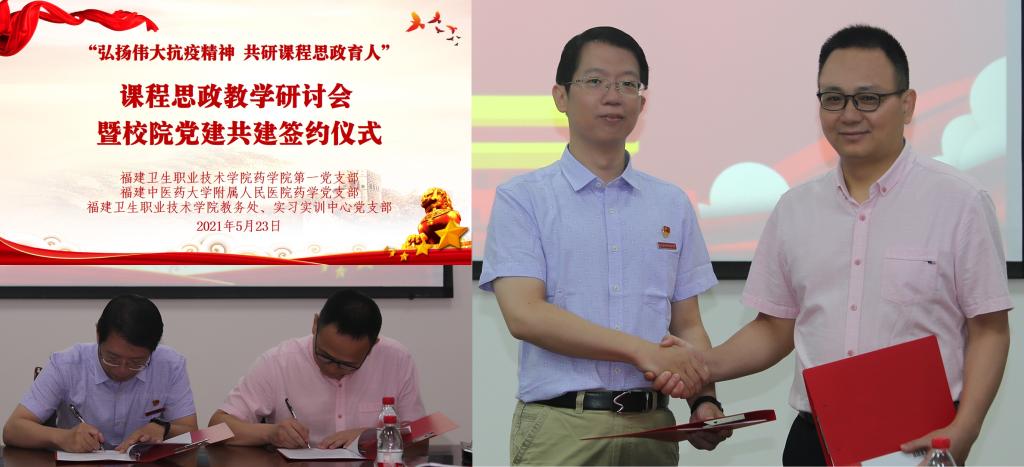 活動(dòng)伊始,藥學(xué)院第一黨支部書記何舒瀾與福建中醫(yī)藥大學(xué)附屬人民醫(yī)院藥學(xué)黨支部書記江川共同簽署結(jié)對(duì)共建協(xié)議書,在與會(huì)黨員的見(jiàn)證下鄭重承諾:將從抗疫精神中共同凝練優(yōu)秀精神基因,共研課程思政、共探思政元素、共建思政資源、共育思政能力、共評(píng)思政成效,以生為本,共商共議,校院互補(bǔ),優(yōu)勢(shì)疊加,探索構(gòu)建“校院思政育人共同體”,共同打造課程思政示范項(xiàng)目。