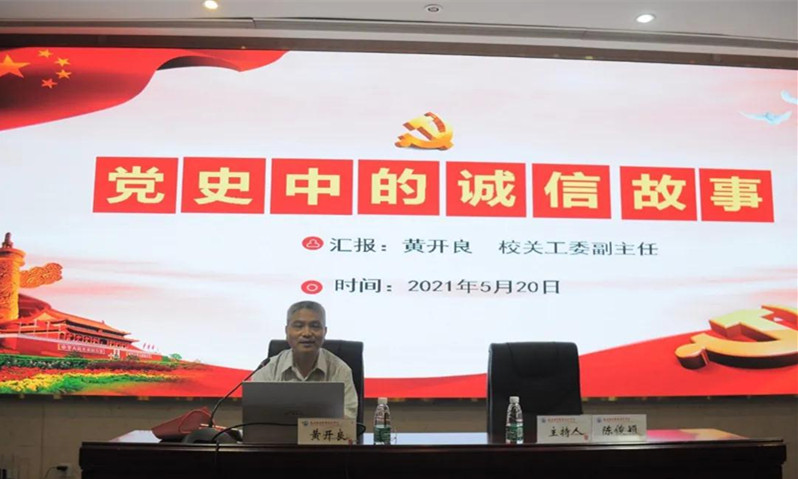 黃開良圍繞開展黨史學(xué)習(xí)教育的重大意義,通過“誠信為公的紅色金融家--高捷成”、“寫在墻上的留款信”等黨史中的誠信故事,將學(xué)習(xí)黨史和誠信教育融匯貫通、有機結(jié)合,講述了黨的百年奮斗史,彰顯中國共產(chǎn)黨以誠信贏得人民信任、取得人民支持,引導(dǎo)學(xué)生用黨的奮斗歷程和偉大成就鼓舞斗志、明確目標,樹立和踐行社會主義核心價值觀。
