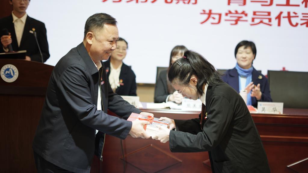 曾武祈為第九期“青馬工程”培訓(xùn)班授旗并贈予學(xué)生代表《習(xí)近平在福建》系列書籍,勉勵青馬學(xué)員從習(xí)近平總書記在閩工作的點點滴滴中磨礪自我,篤定共產(chǎn)主義信仰。