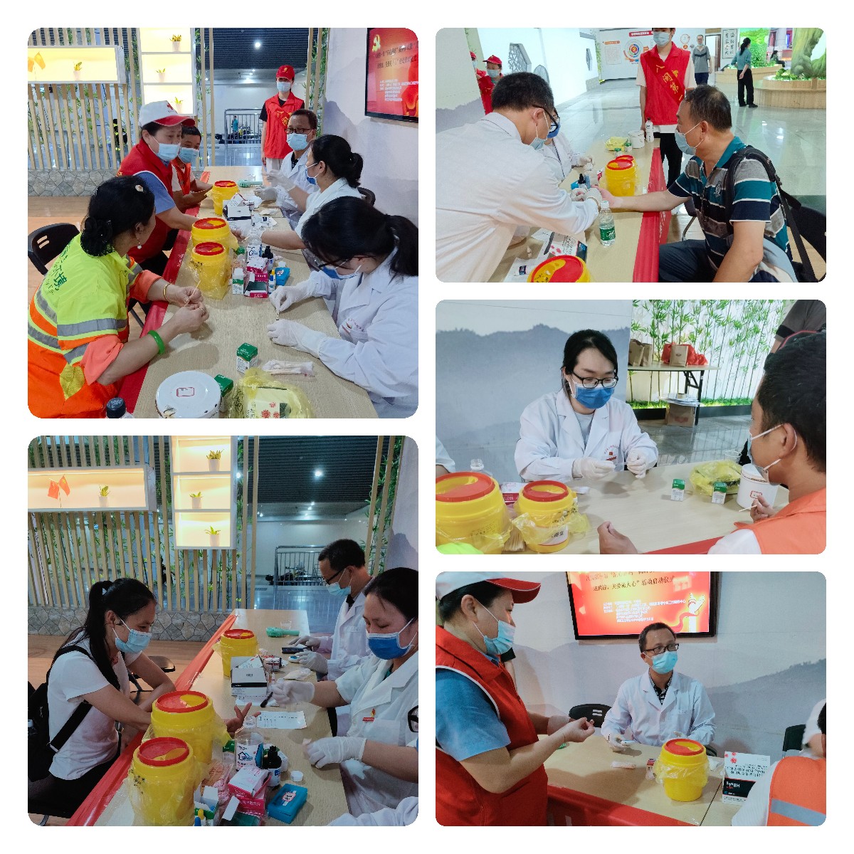 吳星祿、余阿妹、盧虹三位教職工作為醫(yī)學(xué)技術(shù)系教師黨支部的支部委員,是本次義診活動(dòng)的主力。他們帶領(lǐng)學(xué)生為參與活動(dòng)的環(huán)衛(wèi)工人、保安等戶外工作者和旅客提供血型、血糖、尿酸、乙肝抗體檢測(cè)等服務(wù),并結(jié)合專(zhuān)業(yè)知識(shí),提醒大家夏天注意合理飲食和作息,保護(hù)心腦血管和脾胃健康。