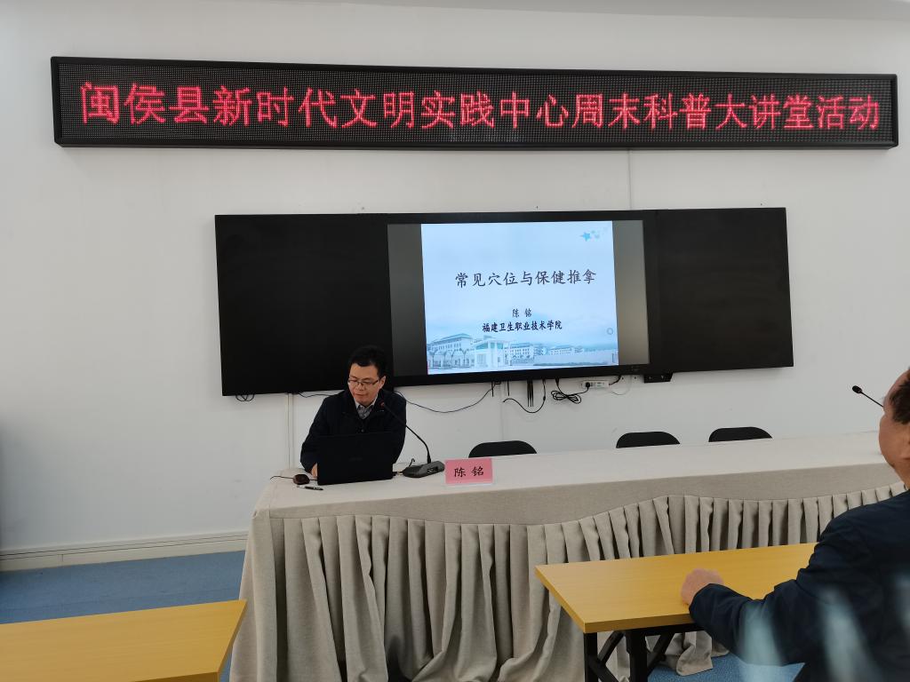 為進(jìn)一步落實(shí)“我為群眾辦實(shí)事”,充分發(fā)揮黨員的先鋒模范作用,推廣中醫(yī)傳統(tǒng)文化,2021年11月20日上午,醫(yī)學(xué)系第三黨支部黨員教師陳銘、葉汝萍、蔡唐彥及學(xué)生們赴閩侯縣新時(shí)代文明實(shí)踐中心開(kāi)展科普講座及義診活動(dòng)。