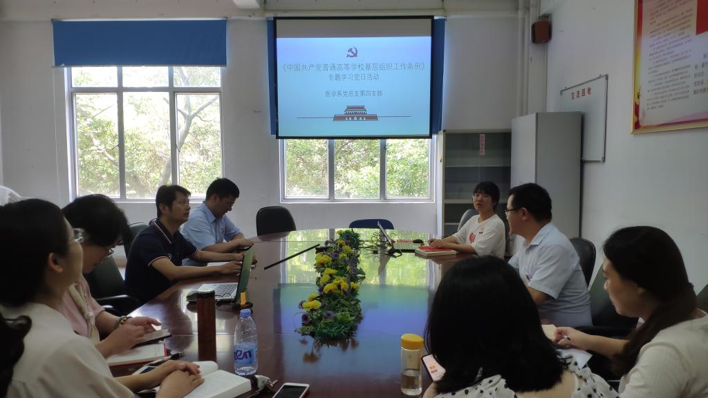 為全面規(guī)范黨史學(xué)習(xí)教育,2021年6月17日,醫(yī)學(xué)系第四黨支部組織開展《中國共產(chǎn)黨普通高等學(xué)?;鶎咏M織工作條例》(以下簡稱《條例》)專題學(xué)習(xí)活動,并由支部副書記修麗莉同志領(lǐng)學(xué)。