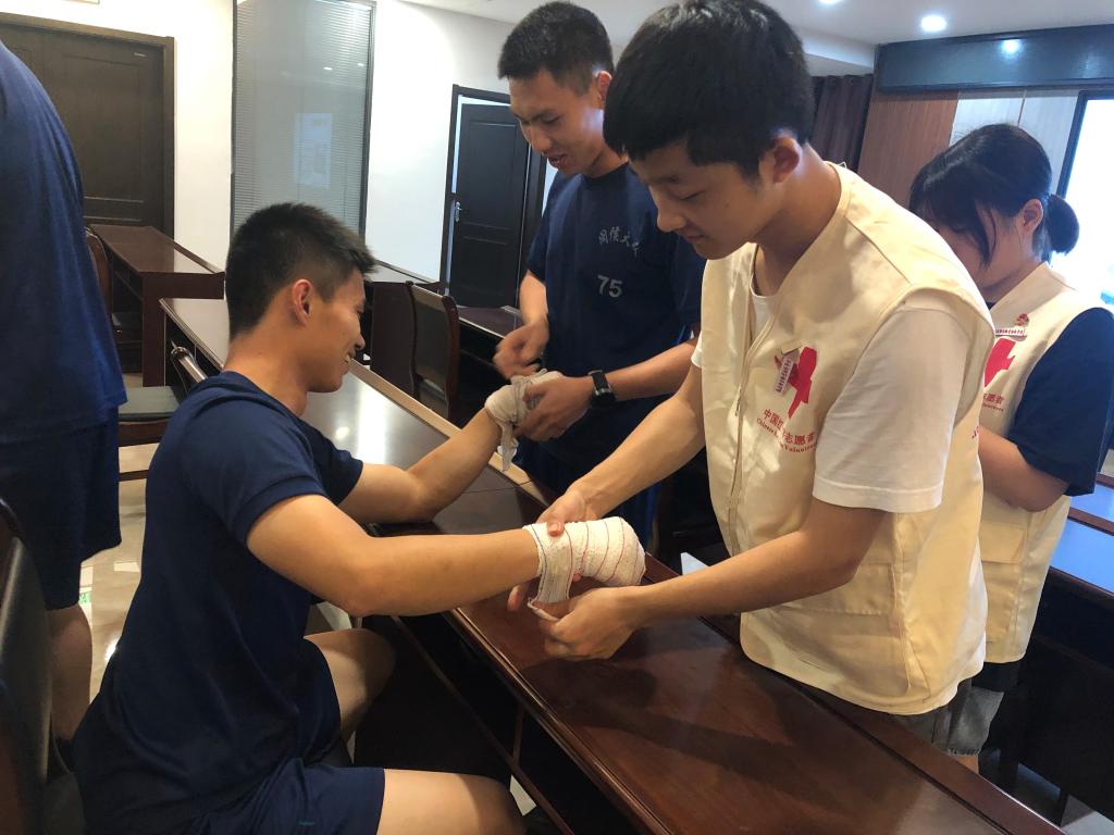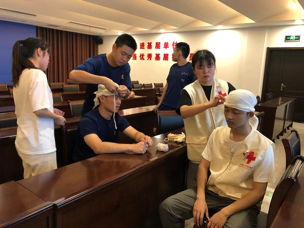 活動(dòng)開始,由醫(yī)學(xué)系紅十字會(huì)負(fù)責(zé)人王婷同學(xué)為消防員們詳細(xì)講解繃帶三角巾包扎法的理論知識(shí),其余同學(xué)依次演示急救中常用的頭部、胸部、手部、膝蓋等部位的三角巾包扎手法。隨后,消防員們兩人一組在同學(xué)們的指導(dǎo)下進(jìn)行包扎實(shí)踐訓(xùn)練。最后,師生現(xiàn)場為消防員們提供刮痧拔罐義診活動(dòng)。