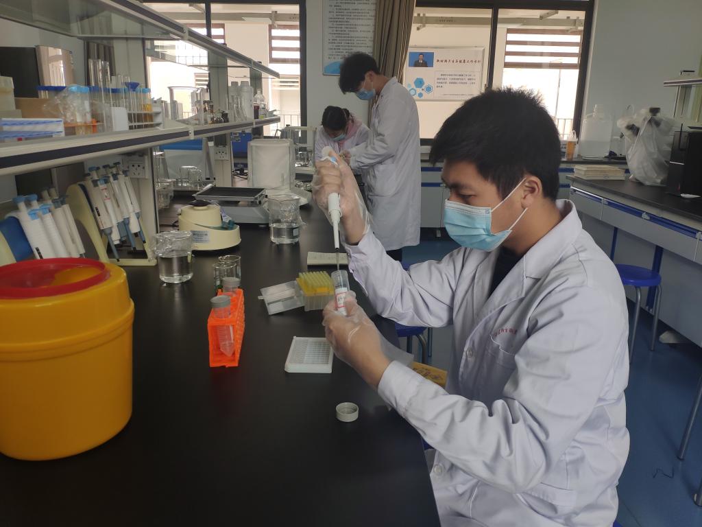 食品質(zhì)量檢測小組對三個食堂的餐飲衛(wèi)生進(jìn)行督查,并隨機(jī)抽取食堂當(dāng)日采購且切洗浸泡后的蔬菜包括萵筍葉、葫蘆、冬瓜、上海青、空心菜、大白菜、花菜、土豆、西紅柿、青椒等,隨機(jī)抽取10余份食堂正在使用及還未使用的食用油,采用酶抑制率法檢測蔬菜中的農(nóng)藥殘留,同時用快速檢測法檢測食用油酸價和過氧化值。檢測工作在健康管理系安全性評價實(shí)訓(xùn)室開展,由專業(yè)教師揭金花、李丹及預(yù)防醫(yī)學(xué)專業(yè)學(xué)生入黨積極分子共同完成。