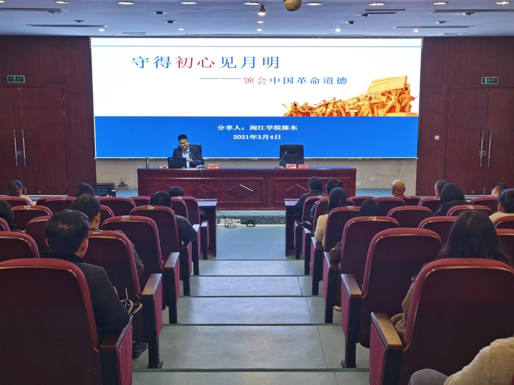 為深入學(xué)習(xí)習(xí)近平新時(shí)代中國(guó)特色社會(huì)主義思想,持續(xù)開展關(guān)于黨史、新中國(guó)史、改革開放史、社會(huì)主義發(fā)展史教育,深入學(xué)習(xí)中國(guó)革命精神,鞏固提升師生理想信念,2021年3月4日下午,閩江學(xué)院馬克思主義學(xué)院陳東副教授應(yīng)邀做題為“中國(guó)革命道德”專題講座。校黨委宣傳部、學(xué)生工作部、團(tuán)委等部門負(fù)責(zé)人、各二級(jí)院系黨總支書記及副書記、馬院全體專兼職教師和全體輔導(dǎo)員共同領(lǐng)會(huì)了中國(guó)革命道德的深刻內(nèi)涵。講座由馬克思主義學(xué)院院長(zhǎng)熊美蘭主持。
