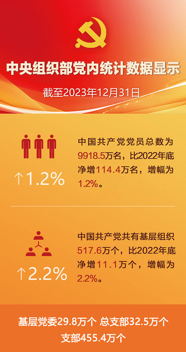 中央組織部2024年6月黨內(nèi)統(tǒng)計(jì)數(shù)據(jù)顯示:截至2023年底,中國共產(chǎn)黨黨員總數(shù)為9918.5萬名,比上年凈增114.4萬名。黨的基層組織517.6萬個,比上年凈增11.1萬個。中國共產(chǎn)黨堅(jiān)持大抓基層的鮮明導(dǎo)向,持續(xù)強(qiáng)基固本、補(bǔ)齊短板弱項(xiàng),不斷嚴(yán)密上下貫通、執(zhí)行有力的組織體系,全面加強(qiáng)黨員隊(duì)伍建設(shè),充分發(fā)揮基層黨組織戰(zhàn)斗堡壘作用和黨員先鋒模范作用,使黨始終保持旺盛生命力和強(qiáng)大戰(zhàn)斗力。推進(jìn)黨的創(chuàng)新理論武裝,不斷健全固本培元、凝心鑄魂的教育體系。理論武裝是健全全面從嚴(yán)治黨體系的基礎(chǔ)工程。堅(jiān)持不懈用習(xí)近平新時(shí)代中國特色社會主義思想凝心鑄魂、強(qiáng)基固本,健全常態(tài)化培訓(xùn)特別是基本培訓(xùn)機(jī)制,把學(xué)習(xí)黨的創(chuàng)新理論作為黨員干部教育培訓(xùn)的主課、必修課,貫穿理論教育、黨性教育和履職能力培訓(xùn)全過程各方面,教育引導(dǎo)廣大黨員干部學(xué)好馬克思主義看家本領(lǐng),自覺做習(xí)近平新時(shí)代中國特色社會主義思想的堅(jiān)定信仰者和忠實(shí)實(shí)踐者。增強(qiáng)教育培訓(xùn)的系統(tǒng)性、針對性、有效性,不斷創(chuàng)新理論武裝的方式方法,堅(jiān)持經(jīng)常性教育和集中性教育相結(jié)合、理論武裝和實(shí)踐運(yùn)用相結(jié)合、強(qiáng)黨性和增本領(lǐng)相結(jié)合,健全落實(shí)以學(xué)鑄魂、以學(xué)增智、以學(xué)正風(fēng)、以學(xué)促干長效機(jī)制。加強(qiáng)對全面從嚴(yán)治黨的研究,加深對新時(shí)代黨的建設(shè)規(guī)律的認(rèn)識,加強(qiáng)“中共黨史黨建學(xué)”學(xué)科體系、學(xué)術(shù)體系、話語體系建設(shè)。弘揚(yáng)理論聯(lián)系實(shí)際的優(yōu)良學(xué)風(fēng),注重看以知促行、學(xué)用結(jié)合的成效,把黨的創(chuàng)新理論轉(zhuǎn)化為堅(jiān)定理想信念、強(qiáng)大精神動力和出色工作業(yè)績。
