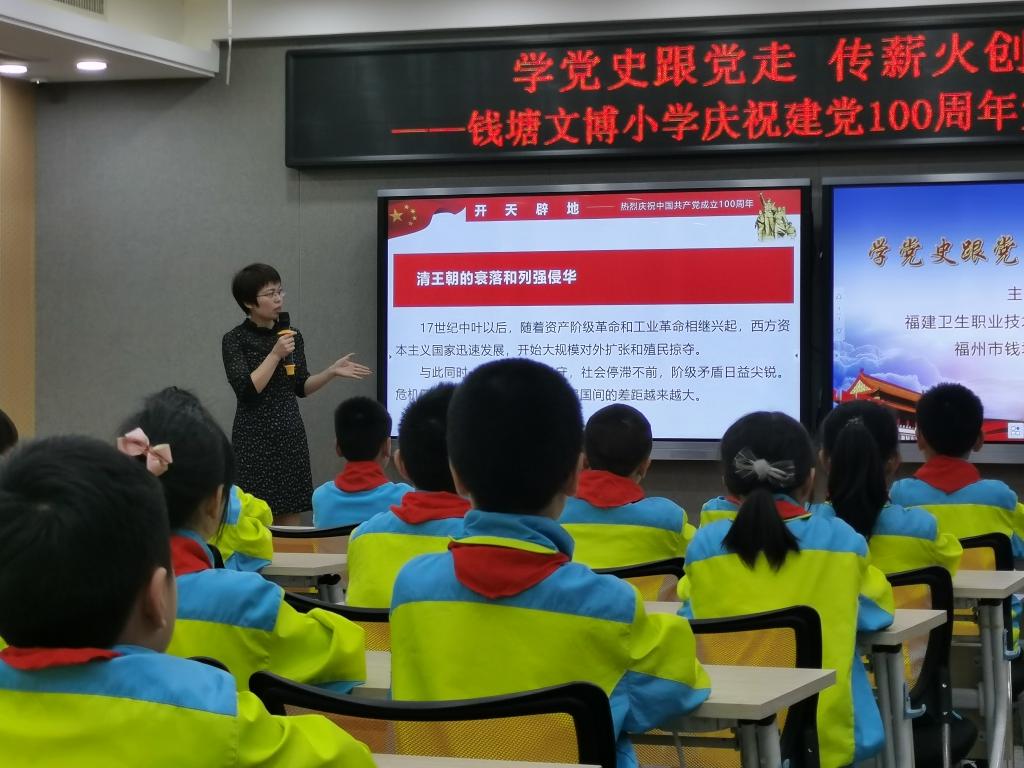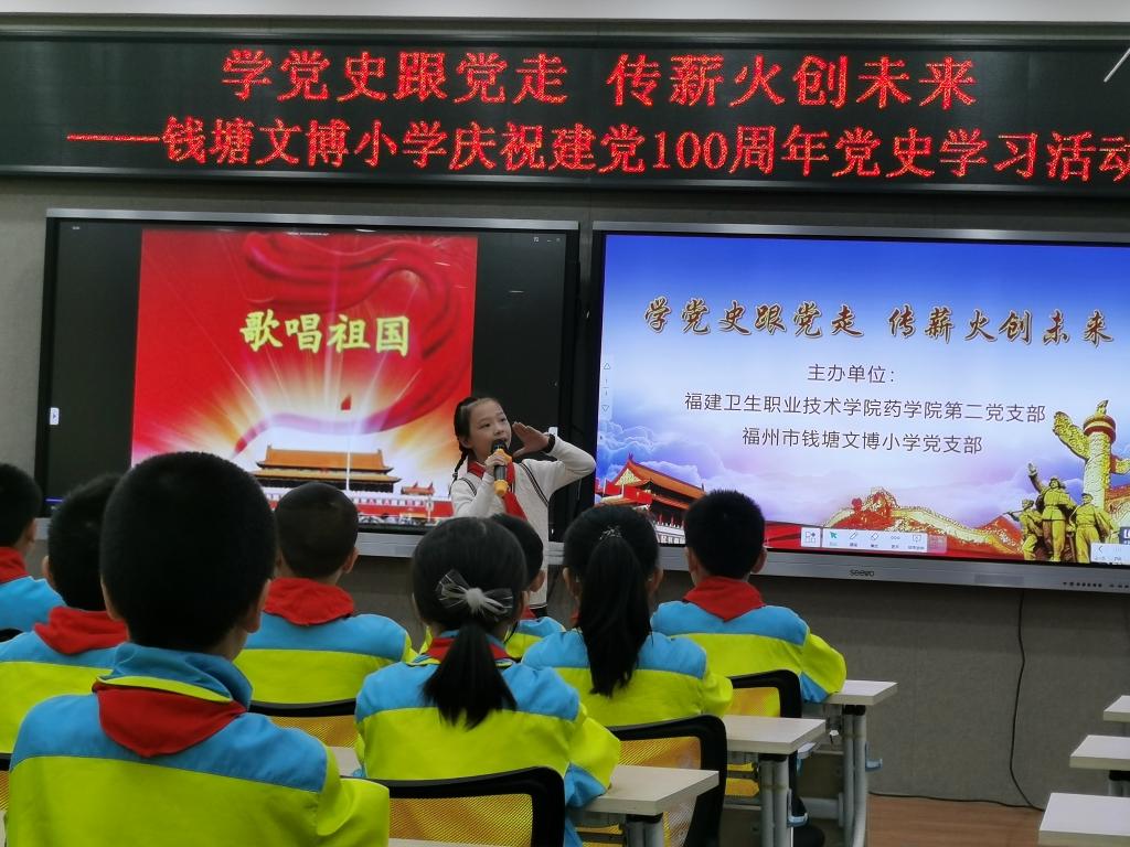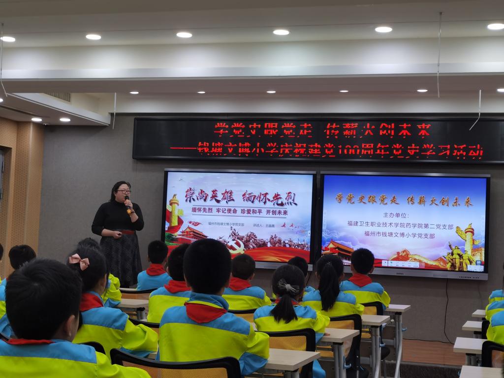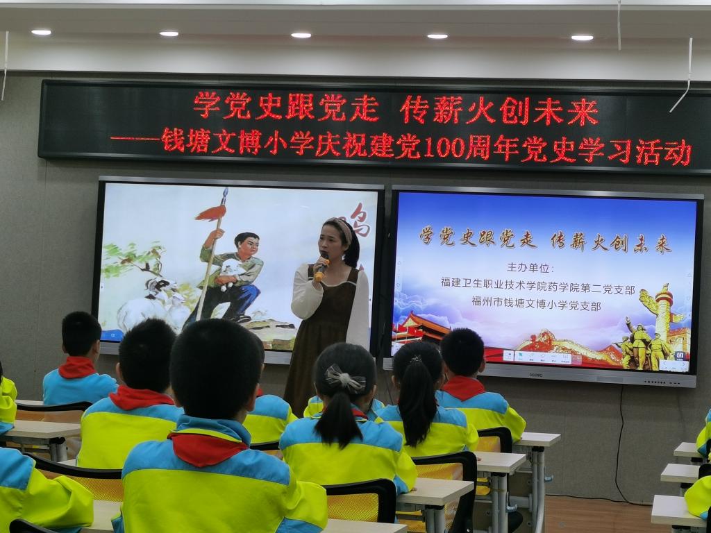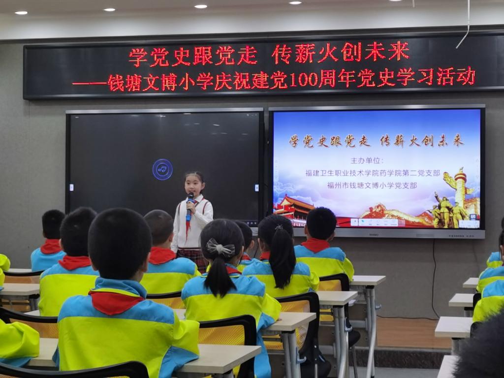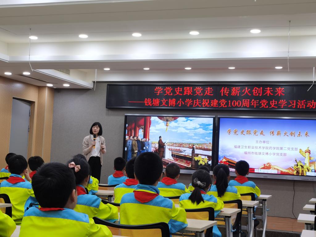 2021年4月16日下午,我校藥學院第二黨支部與福州市錢塘文博小學黨支部聯(lián)合開展了以“學黨史跟黨走,傳薪火創(chuàng)未來”為主題的黨史學習教育。其余未能到現(xiàn)場的師生,通過現(xiàn)場直播的方式同步線上參與活動。