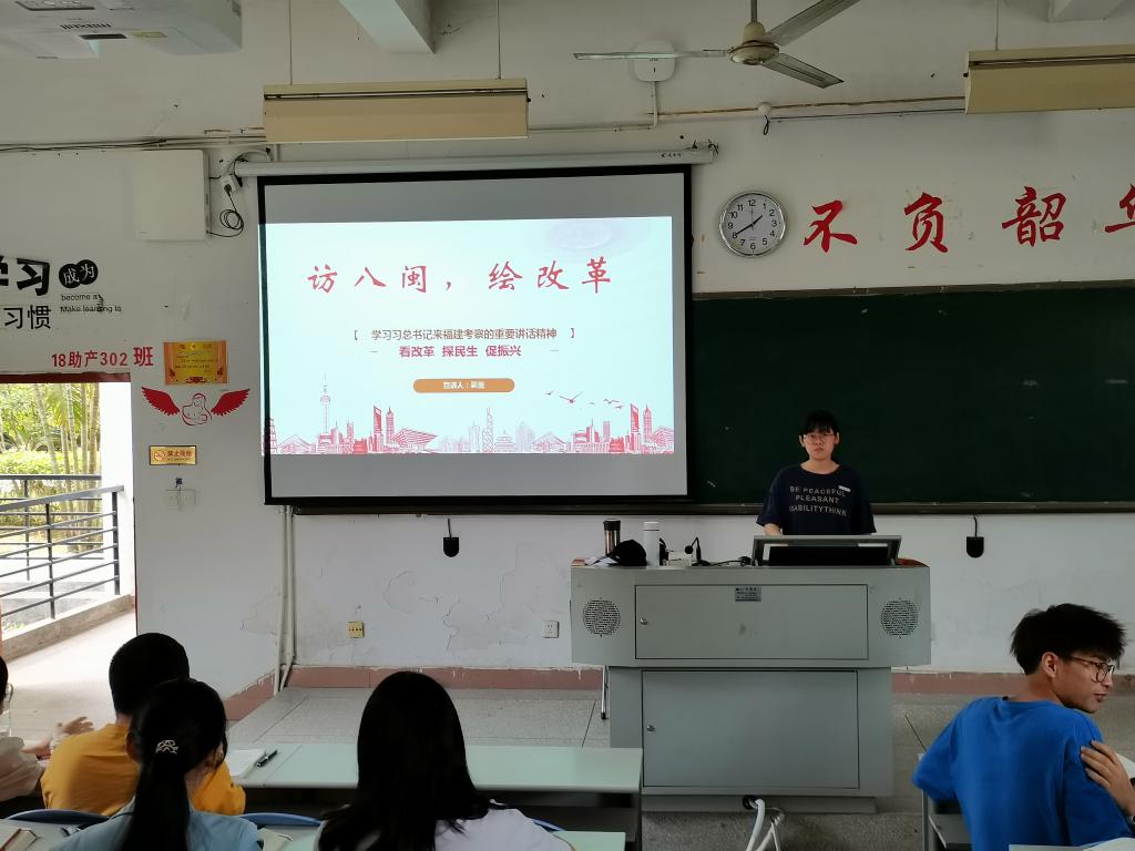 此次活動(dòng)由吳蕾同學(xué)為同學(xué)們進(jìn)行《訪八閩繪改革》的分享和交流。吳蕾從生態(tài)保護(hù)、衛(wèi)生健康、鄉(xiāng)村振興、城市建設(shè)、科技創(chuàng)新、改革深化、文化傳承、人才培養(yǎng)等方面,對(duì)習(xí)近平總書記在福建考察時(shí)的重要講話精神做了梳理和解讀。吳蕾講解通俗易懂,獲得同學(xué)們的陣陣掌聲。宣講結(jié)束后,胡濟(jì)林進(jìn)行點(diǎn)評(píng)分析,鼓勵(lì)大家認(rèn)真領(lǐng)會(huì)習(xí)近平總書記重要講話精神,學(xué)以致用,用實(shí)際行動(dòng)去譜寫我校新篇章。
