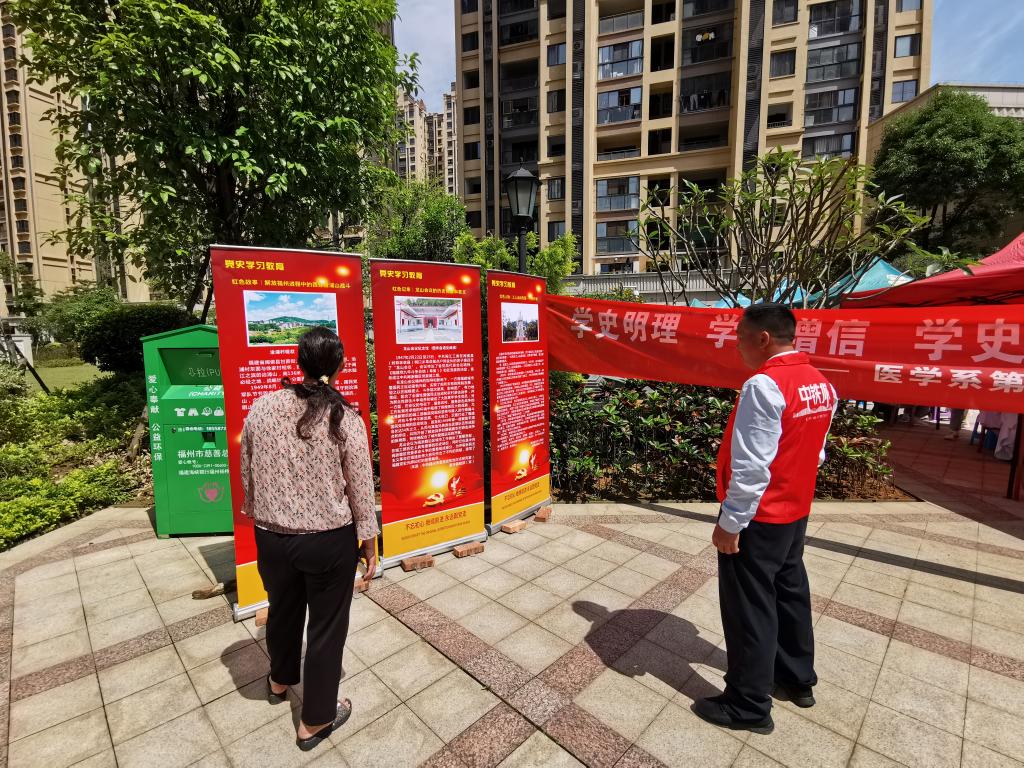 為貫徹落實(shí)習(xí)近平總書記來閩考察重要講話精神,扎實(shí)開展“再學(xué)習(xí)、再調(diào)研、再落實(shí)”活動(dòng),發(fā)揮“雙帶頭人”教師黨支部工作室輻射作用,結(jié)合2021年全國科技活動(dòng)周的通知要求, 2021年5月9日,醫(yī)學(xué)系第四黨支部教師黨員、醫(yī)學(xué)基礎(chǔ)部部分教師和院紅十字會(huì)青年團(tuán)員到閩侯荊溪社區(qū)中鐵城,為社區(qū)居民宣揚(yáng)黨史學(xué)習(xí),開展“學(xué)黨史 普科技 送健康 知感恩 ”健康科普進(jìn)社區(qū)主題黨日活動(dòng)。
