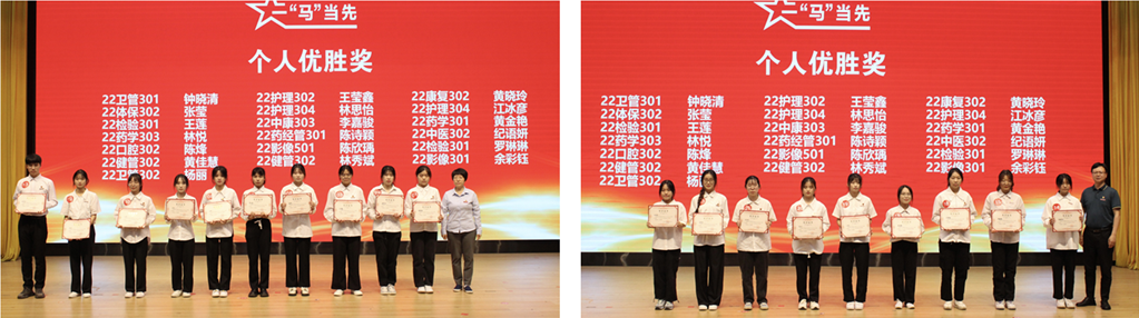 經(jīng)過激烈角逐,護(hù)理學(xué)院榮獲團(tuán)體一等獎,藥學(xué)院榮獲團(tuán)體二等獎,醫(yī)學(xué)院榮獲團(tuán)體三等獎。22助產(chǎn)303鄭曉芳獲得個人一等獎,22助產(chǎn)301蔡麗梅、22藥經(jīng)管302應(yīng)婉希獲得個人二等獎,22中醫(yī)302廖海濤、22影像301林雨婷、22藥學(xué)301林夢云獲得個人三等獎,22衛(wèi)管301鐘曉清等19名同學(xué)獲得個人優(yōu)勝獎。