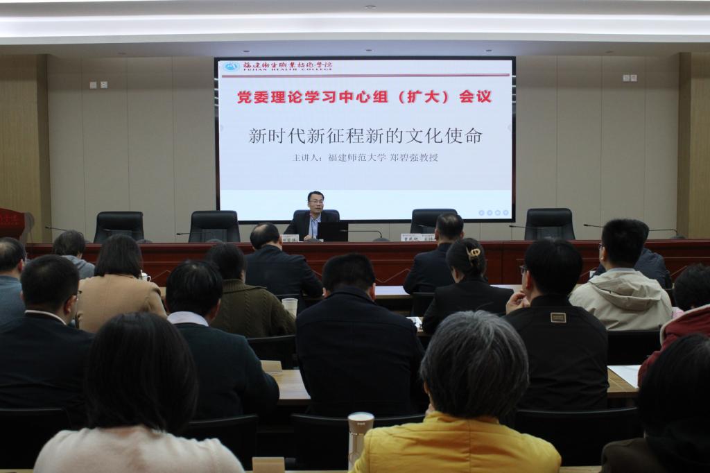 1月18日下午,校黨委理論學(xué)習(xí)中心組召開學(xué)習(xí)(擴(kuò)大)會(huì)議,福建師范大學(xué)鄭碧強(qiáng)教授應(yīng)邀到會(huì),作題為“新時(shí)代新征程新的文化使命”的專題輔導(dǎo)報(bào)告。校領(lǐng)導(dǎo)、全體中層干部參加會(huì)議,校黨委書記曾武祈主持會(huì)議。