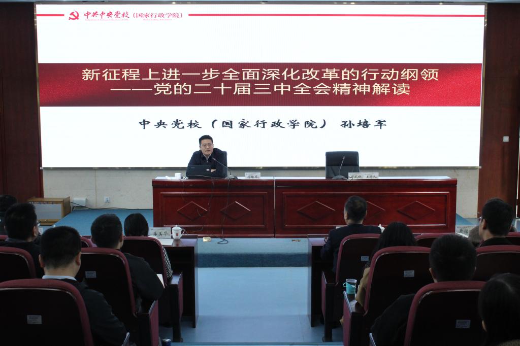 黨的二十屆三中全會是我們黨的歷史上又一個重要里程碑,是進(jìn)一步全面深化改革、推進(jìn)中國式現(xiàn)代化的總動員、總部署,深刻回答了在新的歷史條件下舉什么旗、走什么路、改什么、為誰改、怎么改等重大問題,在黨和國家發(fā)展進(jìn)程中具有極其重大和深遠(yuǎn)的歷史意義。為進(jìn)一步學(xué)習(xí)貫徹落實黨的二十屆三中全會精神,完整、準(zhǔn)確、全面理解《決定》的重大意義、措施要求,切實把全會精神轉(zhuǎn)化為干事創(chuàng)業(yè)的精氣神、改革創(chuàng)新的源動力,促進(jìn)學(xué)校高質(zhì)量發(fā)展。12月13日,校黨委理論學(xué)習(xí)中心組舉行擴大會議,邀請中央黨校孫培軍教授為我們作《新征程上進(jìn)一步全面深化改革的行動綱領(lǐng)——黨的二十屆三中全會精神解讀》專題輔導(dǎo)報告。會議由校黨委書記曾武祈主持,校領(lǐng)導(dǎo)、副科級以上干部、支部書記、專職組織員、馬克思主義學(xué)院全體教師及團學(xué)骨干代表共同參加會議。