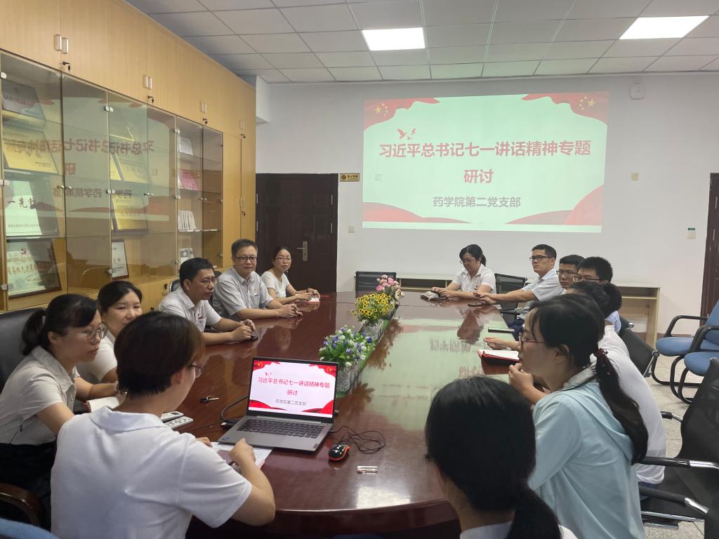 2021年7月1日,慶祝中國共產(chǎn)黨成立100周年大會在北京天安門廣場隆重舉行。中共中央總書記、國家主席、中央軍委主席習(xí)近平發(fā)表重要講話。藥學(xué)院第二黨支部全體黨員在大會直播結(jié)束后于藥學(xué)院會議室集中,圍繞習(xí)近平總書記“七一”重要講話開展了專題研討。本次專題研討由支部書記劉丹丹同志主持。