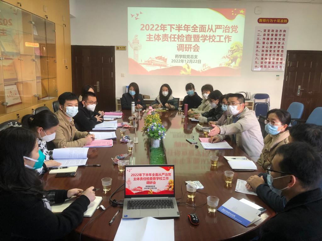 2022年12月22日,藥學(xué)院黨總支在會(huì)議室召開(kāi)2022年下半年全面從嚴(yán)治黨主體責(zé)任檢查暨學(xué)校工作調(diào)研會(huì)。校黨委委員、副校長(zhǎng)周雄,校黨委組織統(tǒng)戰(zhàn)部副部長(zhǎng)謝宗穎,校黨委宣傳部專(zhuān)技人員曾琳玲,醫(yī)學(xué)院黨總支專(zhuān)職組織員陳恩平一行到場(chǎng)指導(dǎo)。藥學(xué)院黨政領(lǐng)導(dǎo)班子成員、總支支委、各支部書(shū)記參加本次會(huì)議。