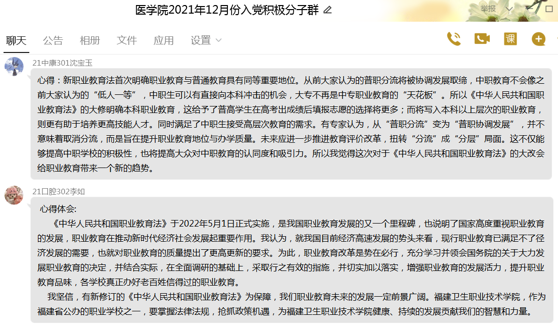 5月11日,醫(yī)學(xué)院第二黨支部采取線上線下相結(jié)合的方式,開(kāi)展“強(qiáng)學(xué)習(xí)、深思考、重提升--學(xué)習(xí)新修訂的《中華人民共和國(guó)職業(yè)教育法》”主題黨日活動(dòng),支部全體黨員、入黨積極分子共同參加了此次活動(dòng)。