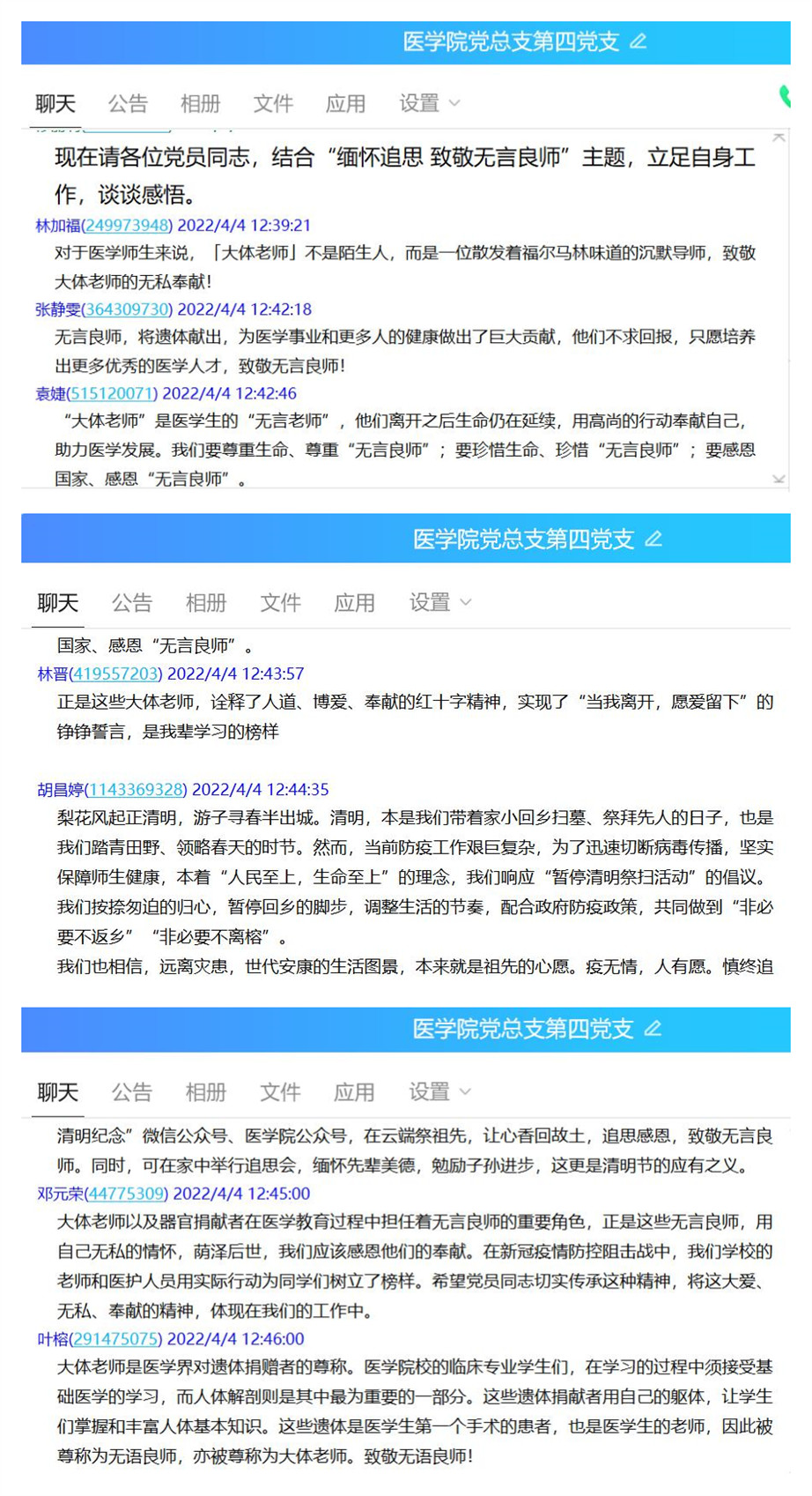 本次“線上緬懷追思 致敬無言良師”活動(dòng)也是支部開展“科普益民,健康相伴”之“敬畏生命,感恩成長”活動(dòng)的一部分。黨員同志除了自身的學(xué)習(xí)感悟,還應(yīng)將其與“課程思政”建設(shè)相結(jié)合,在各自的課程授課中,教育新時(shí)代的青年從無言良師精神、英雄先烈精神、抗疫英雄精神中汲取砥礪前行的動(dòng)力,用奮斗為祖國貢獻(xiàn)青春力量!