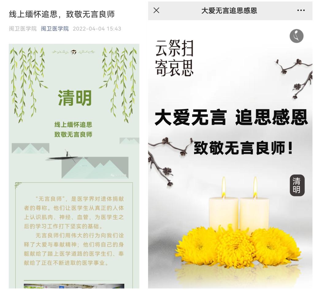 在本次活動(dòng)前期,支部制作了專題追思推文,及線上云祭掃鏈接,發(fā)布于醫(yī)學(xué)院公眾號(hào),支部各位黨員同志、解剖學(xué)教研室教師通過轉(zhuǎn)發(fā)宣傳,號(hào)召各班級(jí)同學(xué)學(xué)習(xí)緬懷?;顒?dòng)一上線,就得到了同學(xué)們的積極參與。