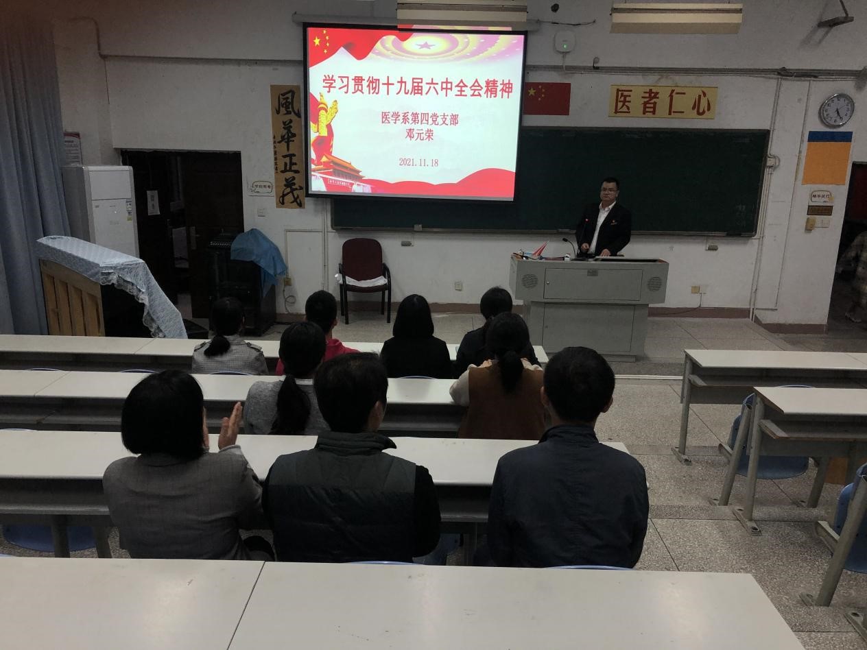 為持續(xù)推進(jìn)黨史學(xué)習(xí)教育,2021年11月18日,醫(yī)學(xué)系第四黨支部組織全體黨員和入黨積極分子一起學(xué)習(xí)黨的十九屆六中全會精神。
