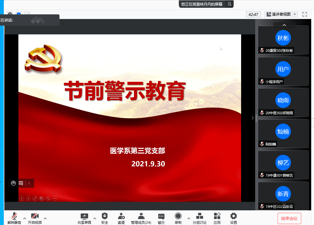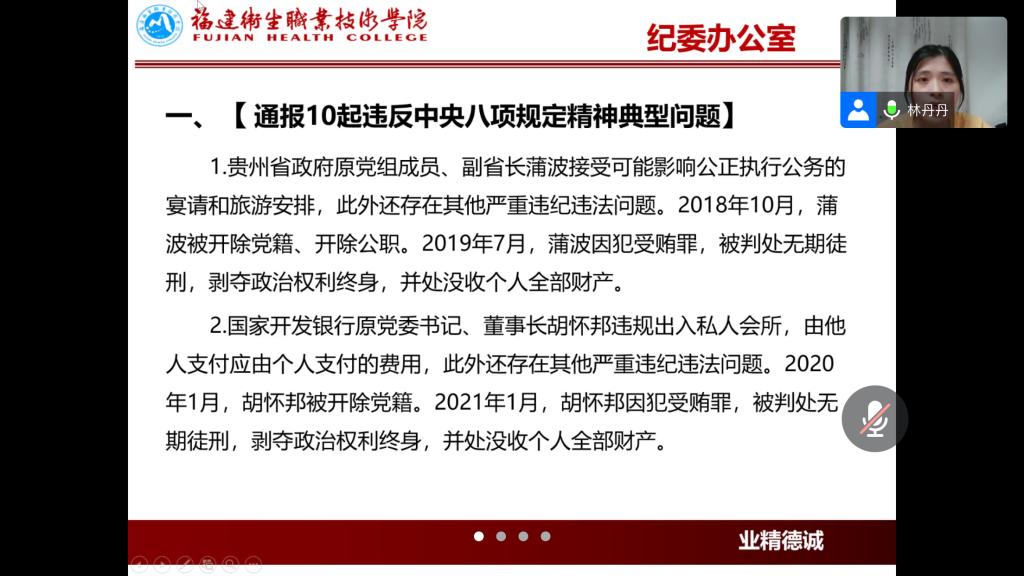 在2021年國慶節(jié)即將來臨之際,為增強支部黨員廉潔自律意識,營造風清氣正的節(jié)日氛圍,2021年9月30日晚,醫(yī)學系第三黨支部開展“節(jié)前警示教育”。此次會議由支部紀檢委員、組織委員林丹丹主持,支部黨員教師們積極參加。
