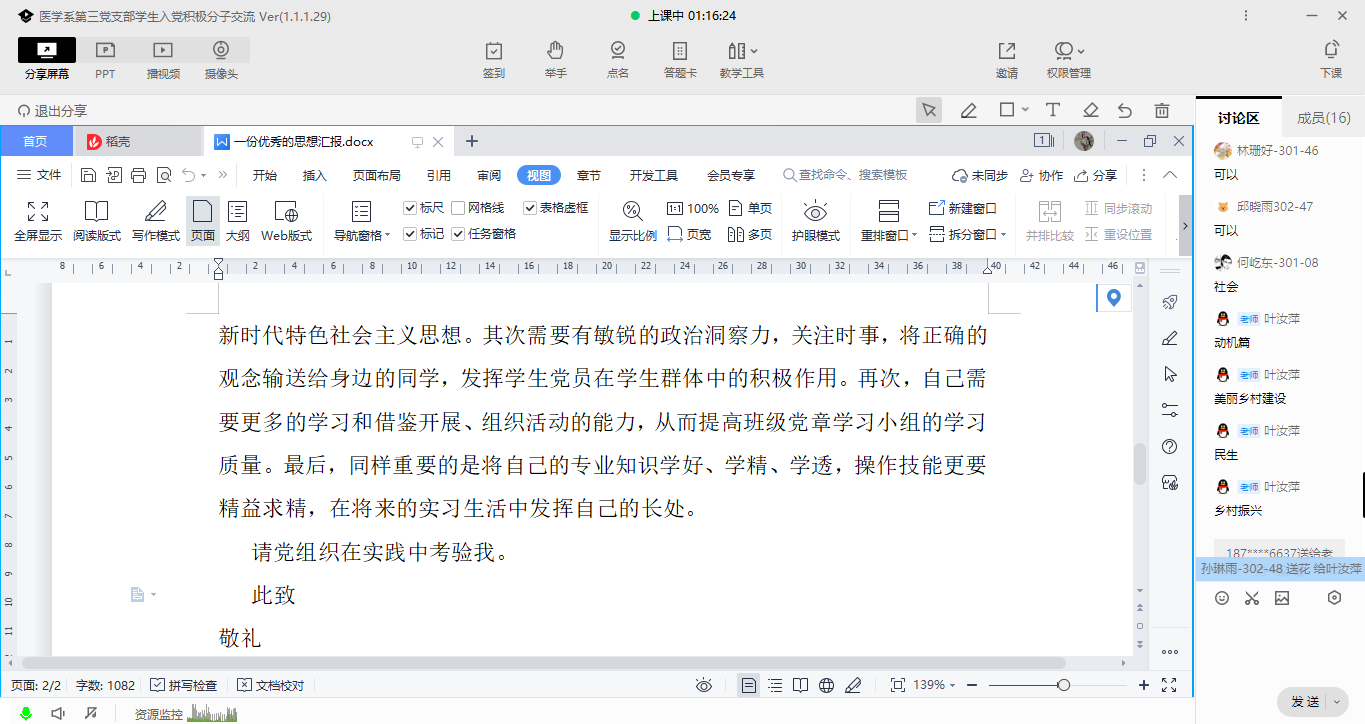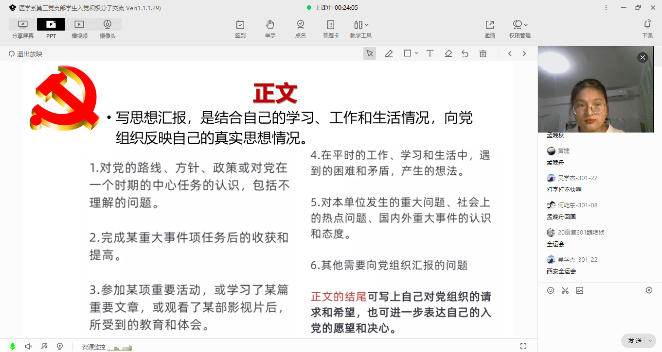 為提高入黨積極分子的思想政治素質(zhì),切實保證新發(fā)展黨員質(zhì)量,2021年9月27日晚,醫(yī)學系第三黨支部副書記葉汝萍利用騰訊課堂為19級(在實習)、20級(在校)入黨積極分子們在線開展思想?yún)R報撰寫培訓。